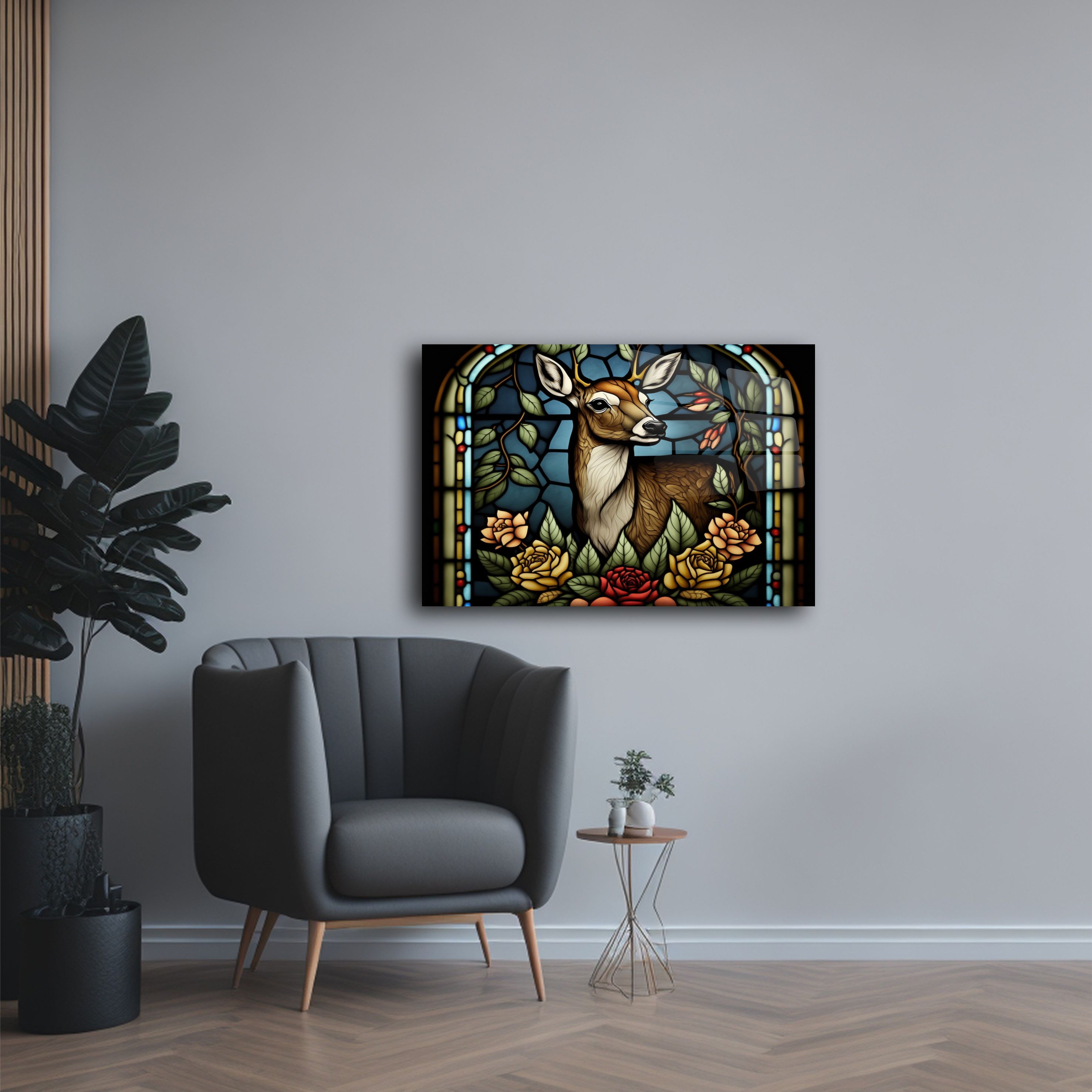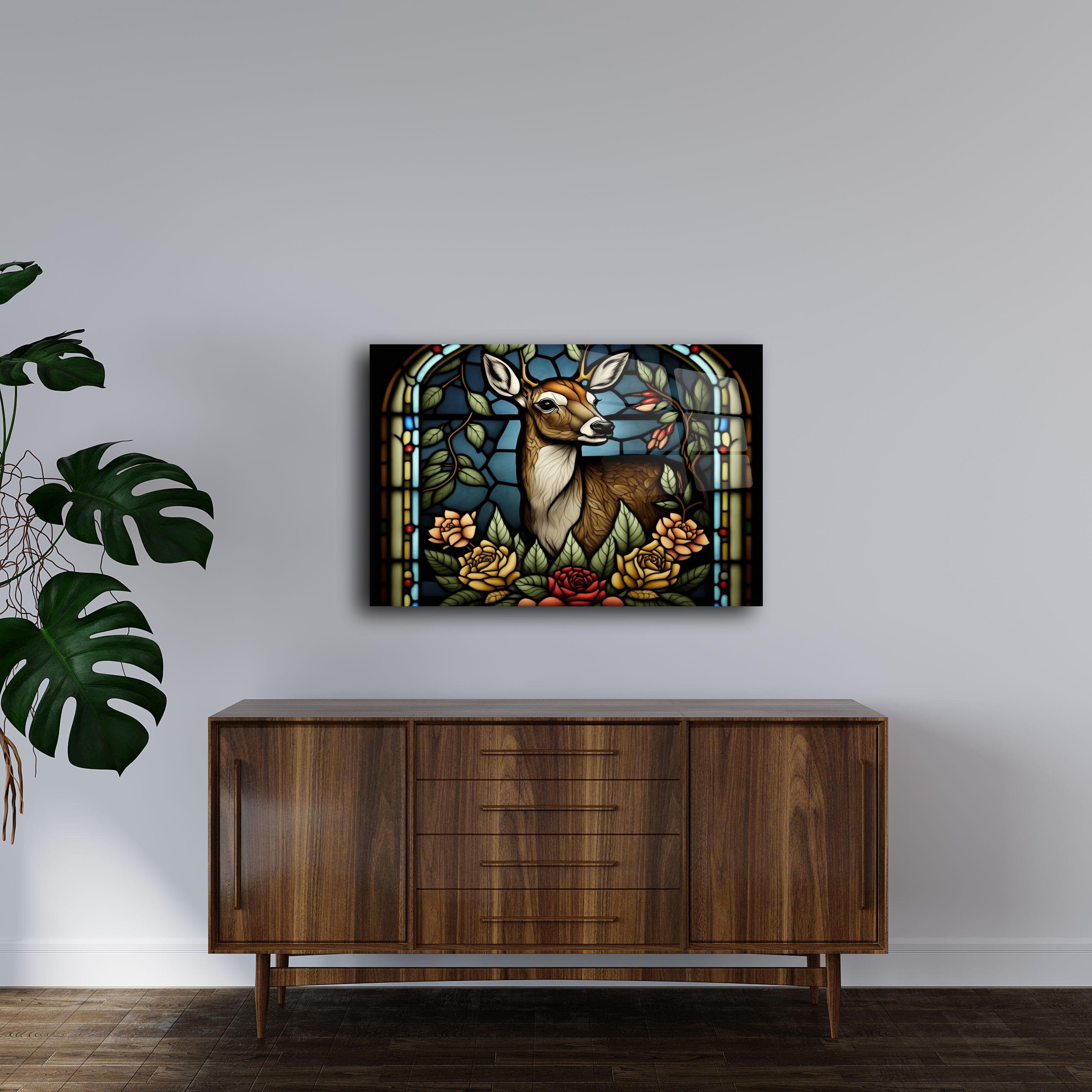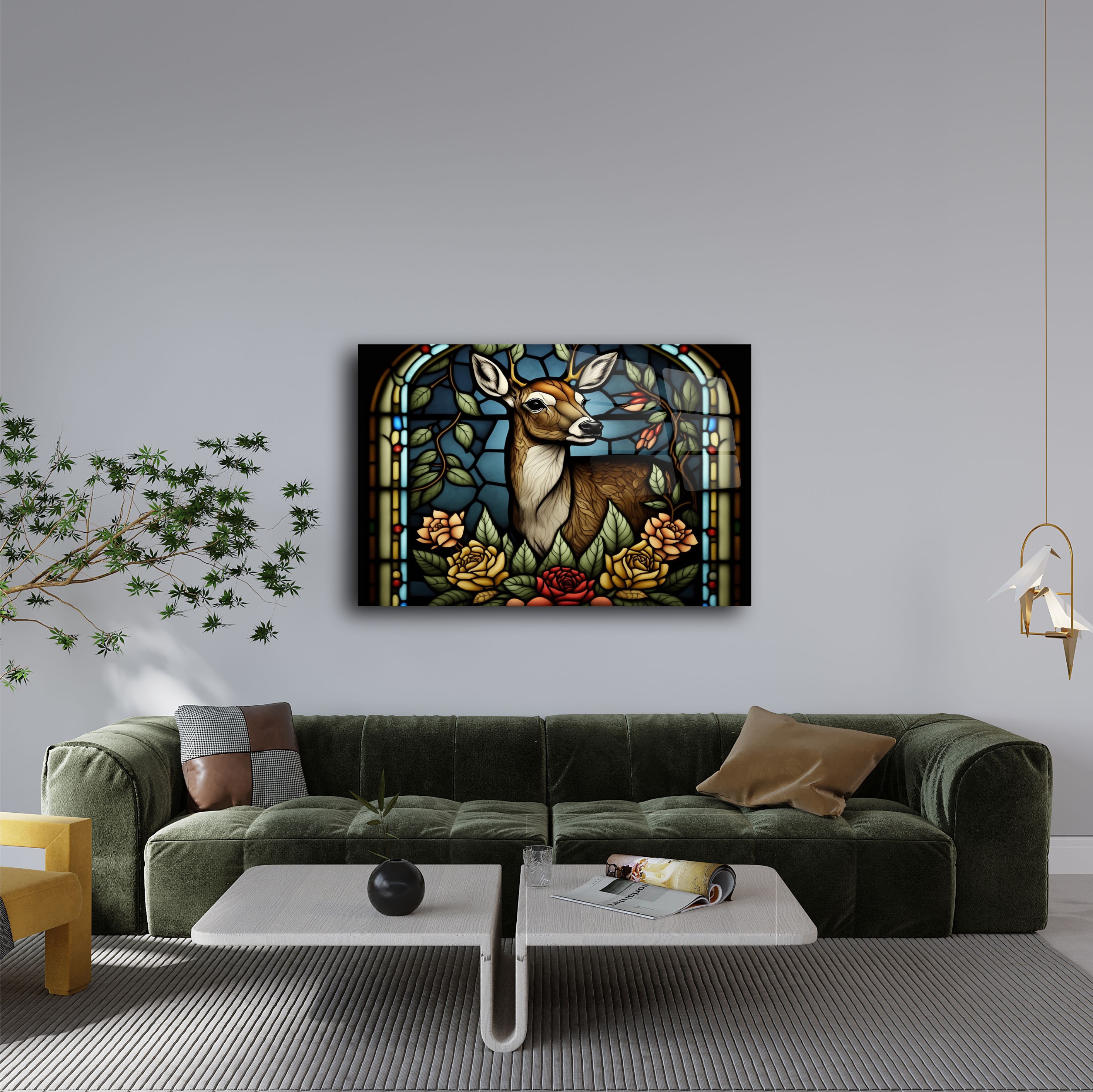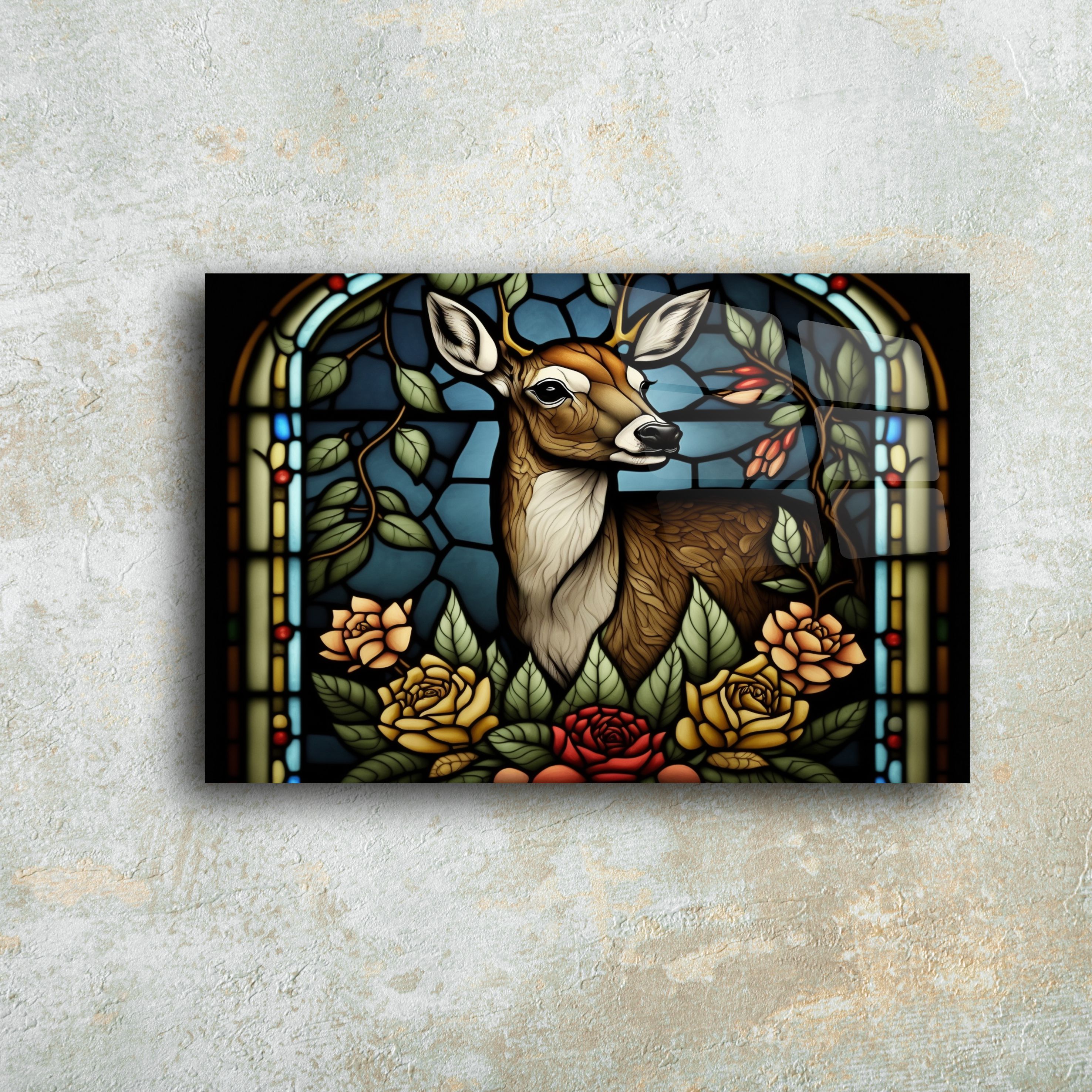 Bu benzersiz cam tablo, estetik ve zarafeti bir araya getirerek ev dekorasyonunuza şıklık katıyor. Geyik figürü ve detaylı çiçek desenleriyle vitray tarzında tasarlanmış olan bu eser, hem klasik hem de modern mekanlarda göz alıcı bir atmosfer yaratır.
