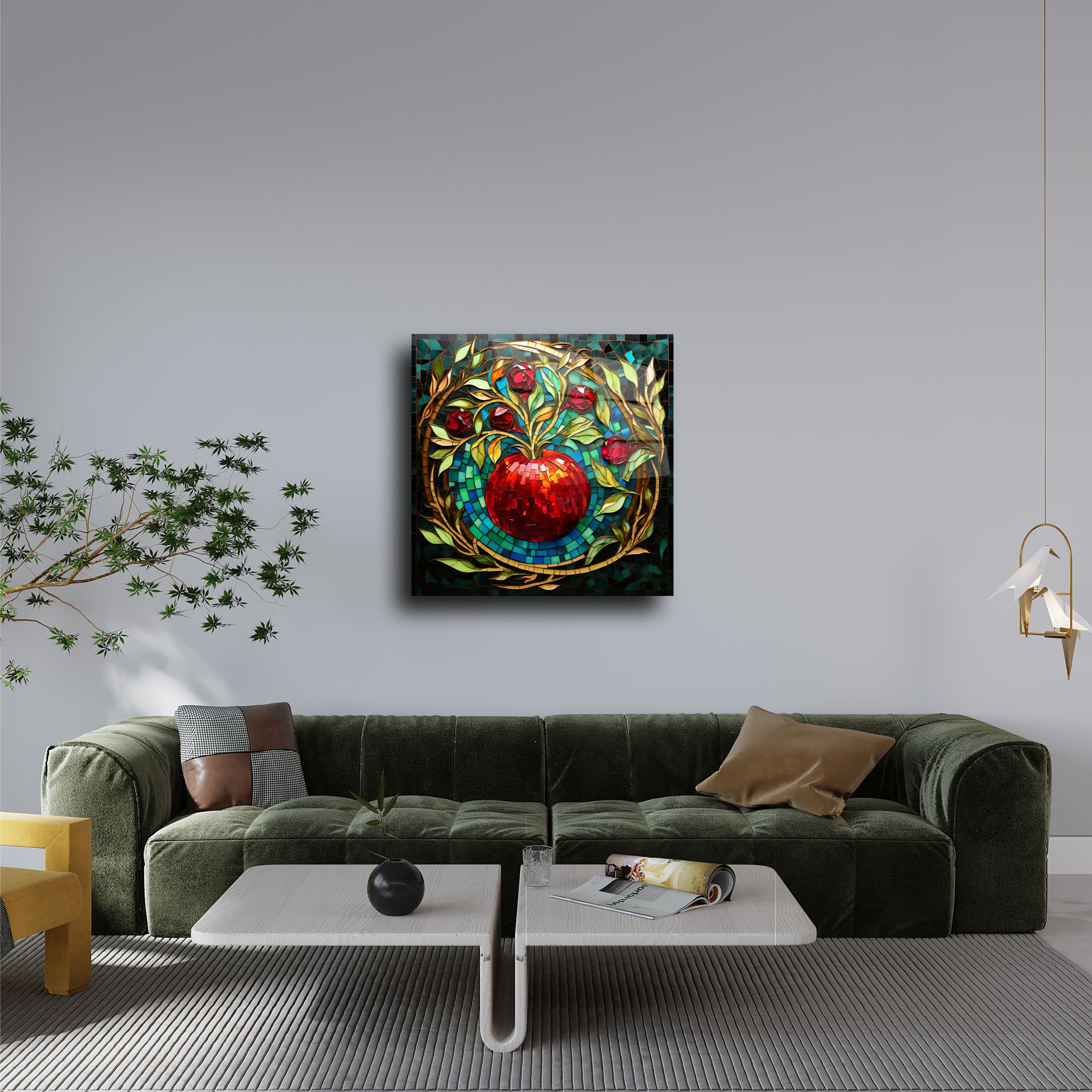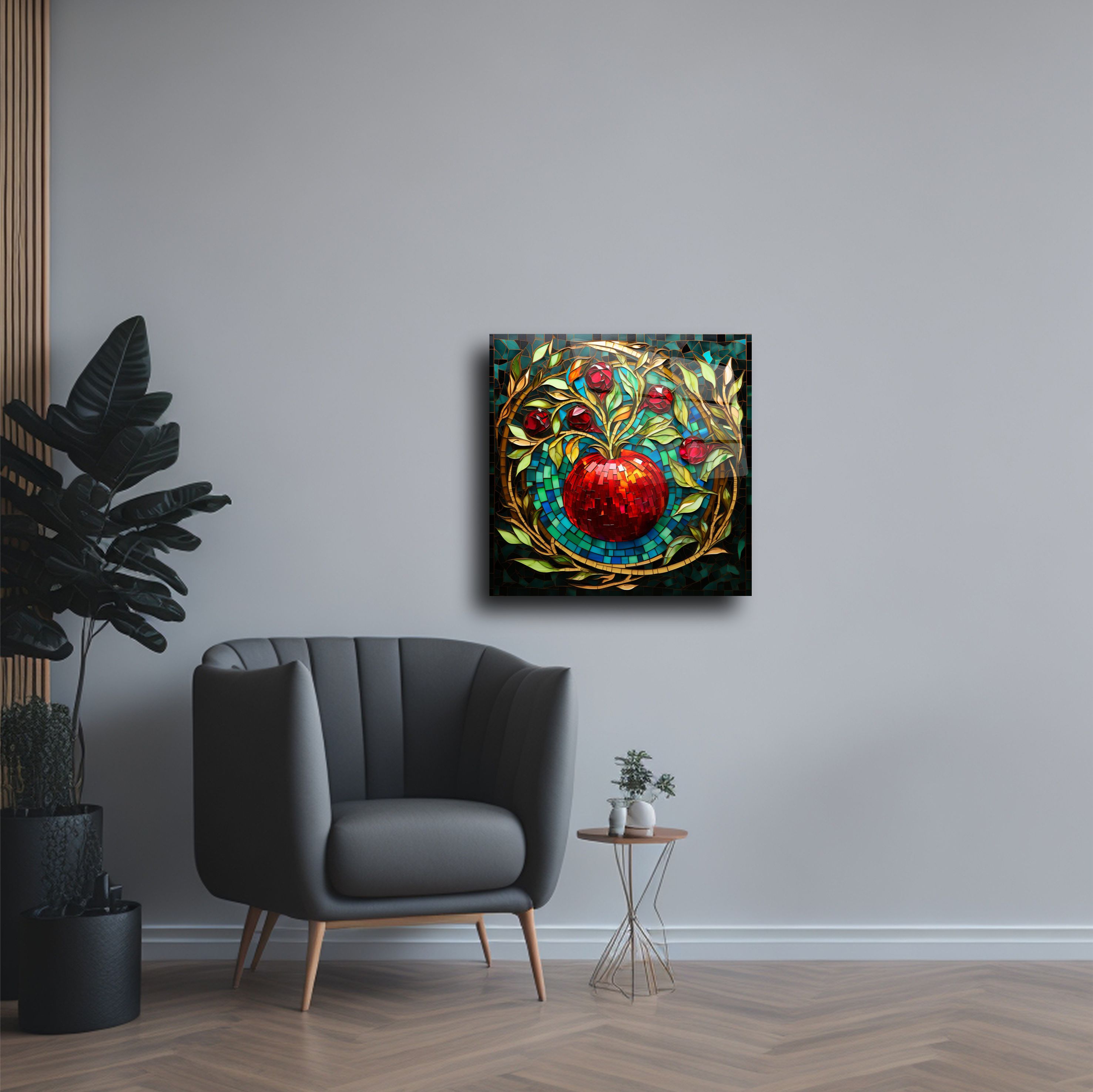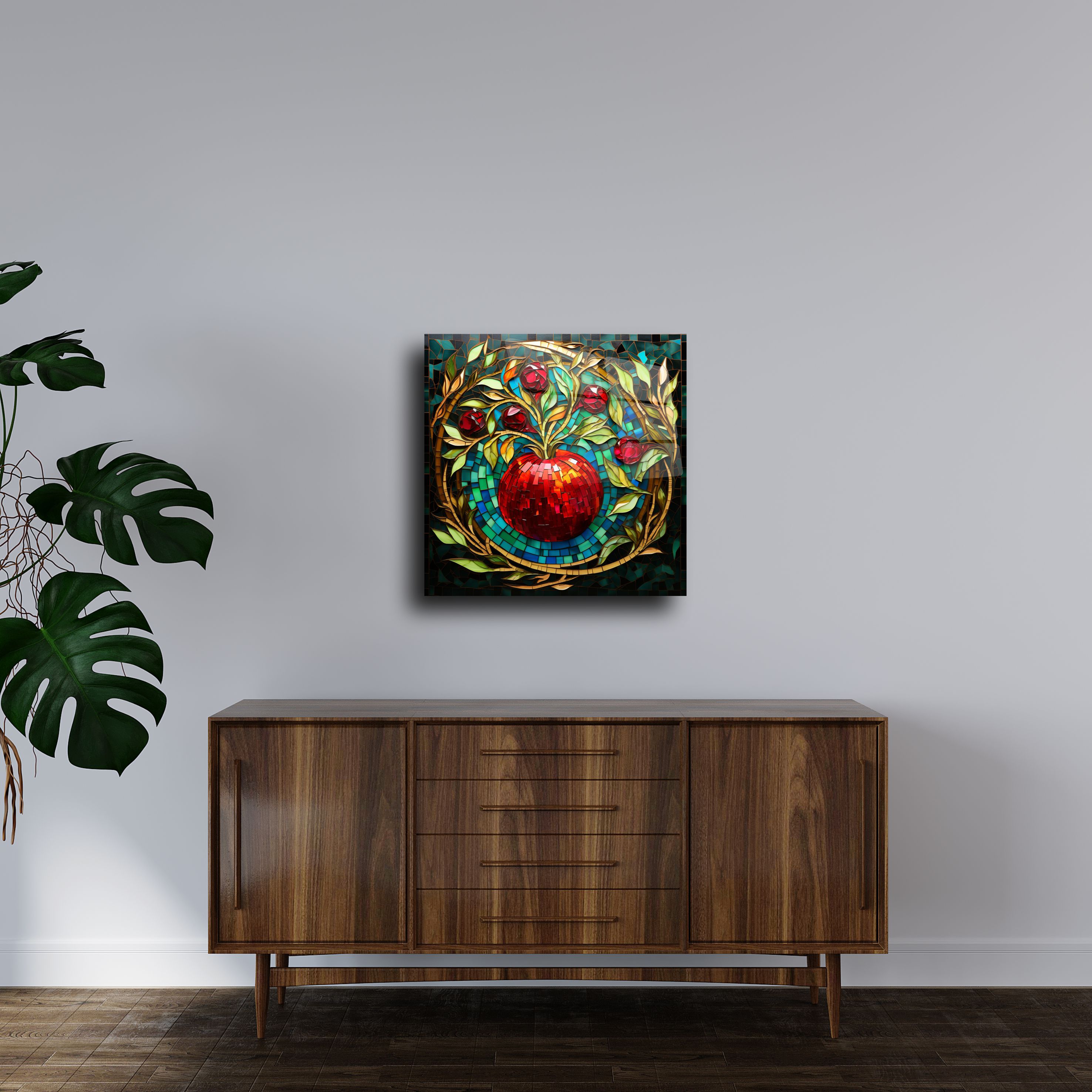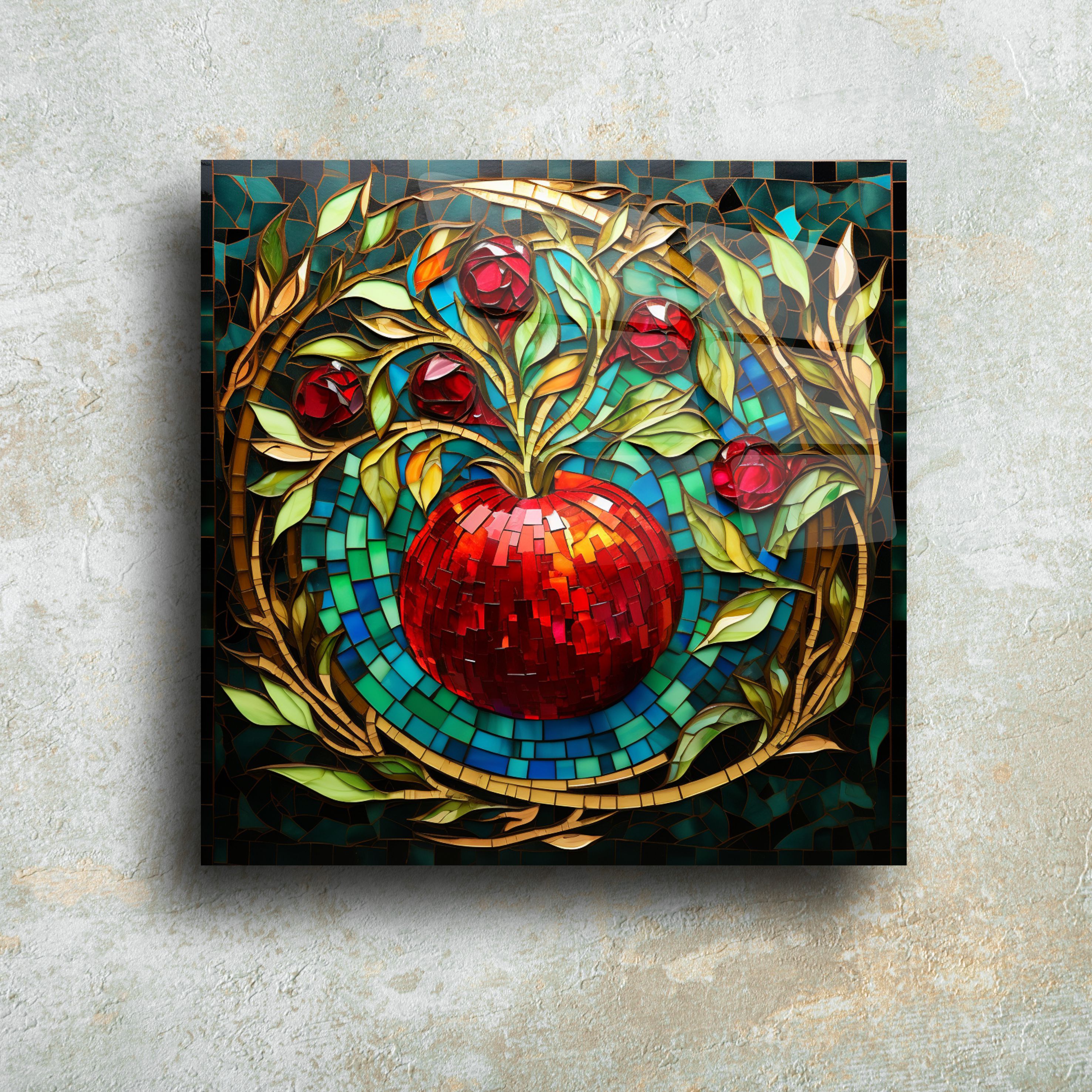 Sanat ve zarafeti bir araya getiren bu elma tasarımlı cam tablo, yaşam alanlarınız için eşsiz bir dekoratif parça sunar. Parlak mozaik detaylarıyla dikkat çeken bu tablo, altın tonları ve zengin kırmızı detaylarıyla zamansız bir estetik sunar.