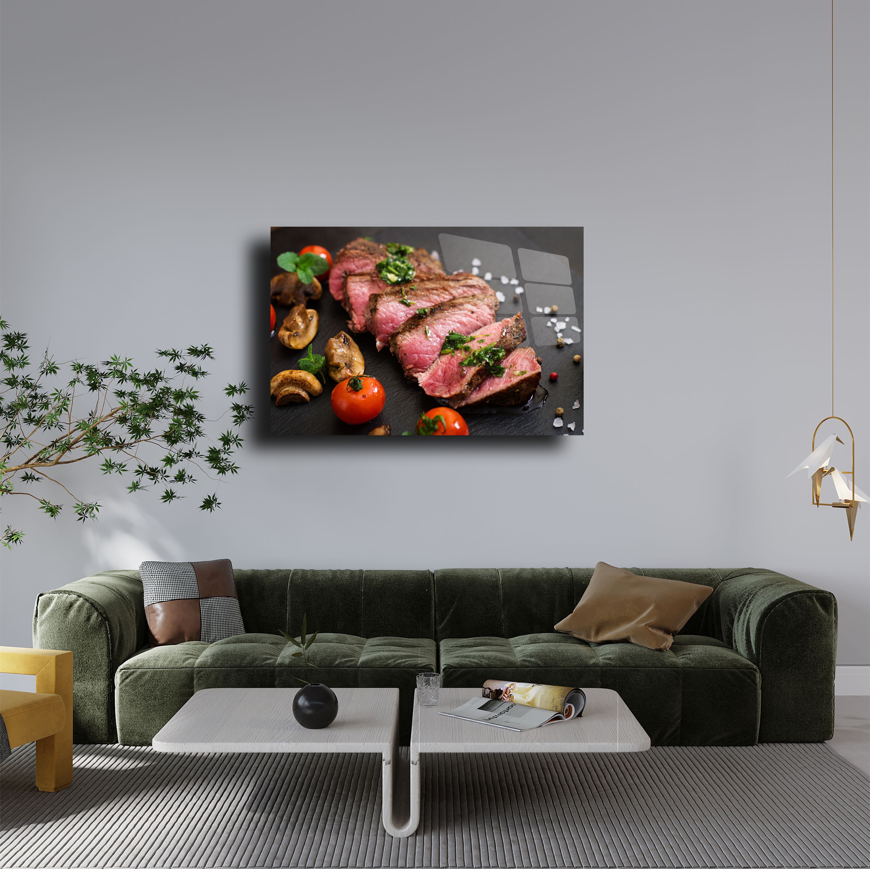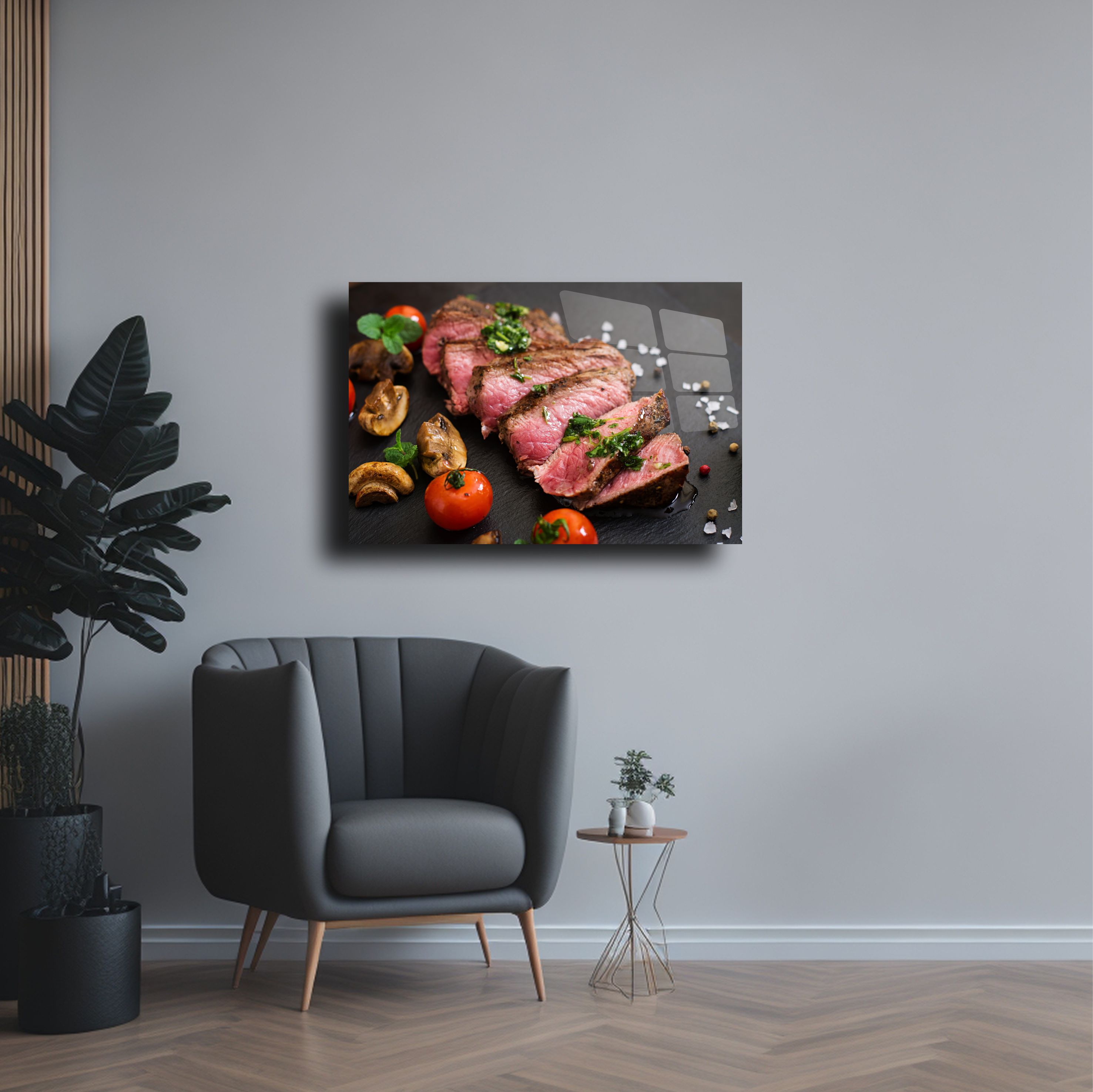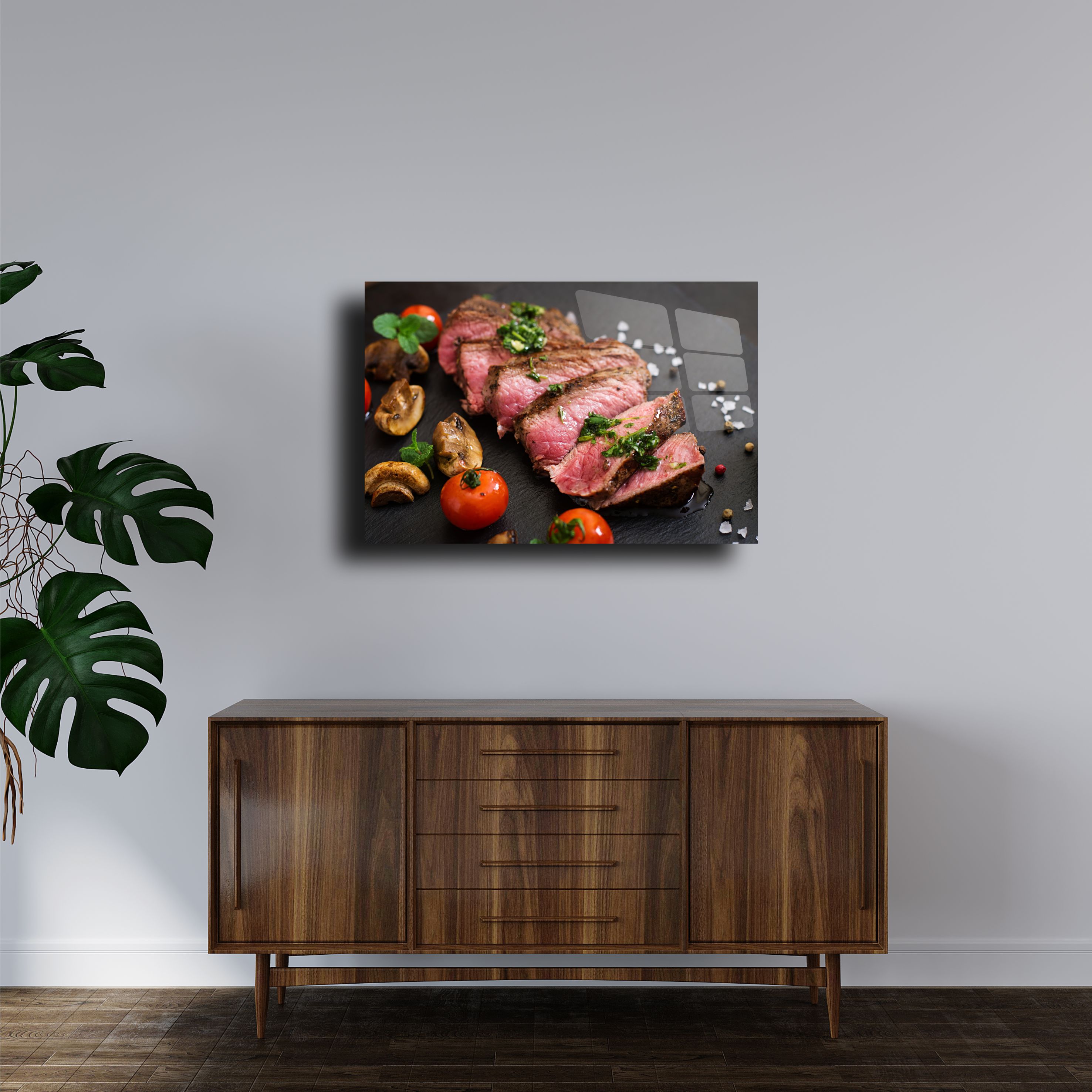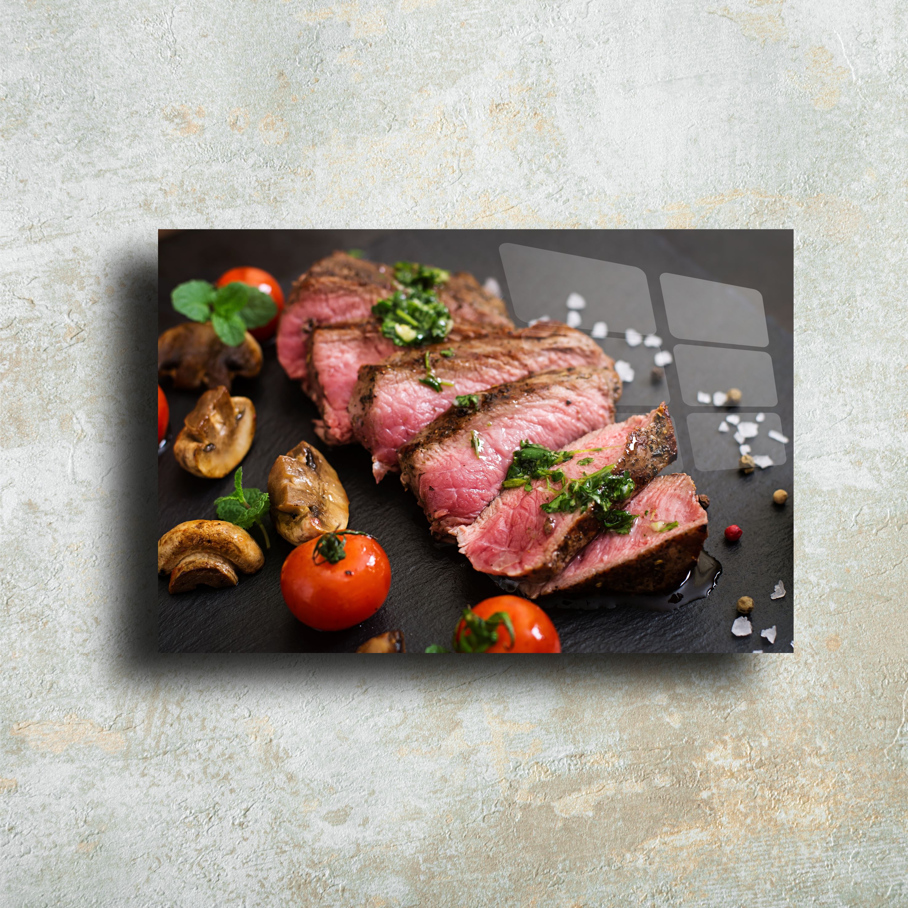 Şık bir sunum ve estetik bir dekor! Dilimlenmiş et temalı bu cam tablo, modern mutfaklar ve yemek alanları için tasarlanmıştır. 4mm temperli cam üzerine UV baskı ile üretilmiş olup, detaylı ve canlı bir görünüme sahiptir. Parlak yüzeyi ve dayanıklı yapısıyla uzun ömürlü bir dekoratif ürün sunar. Mutfaklar, kafe duvarları veya yemek alanları için ideal bir seçimdir. Kolay montaj aparatlarıyla birlikte gönderilir.