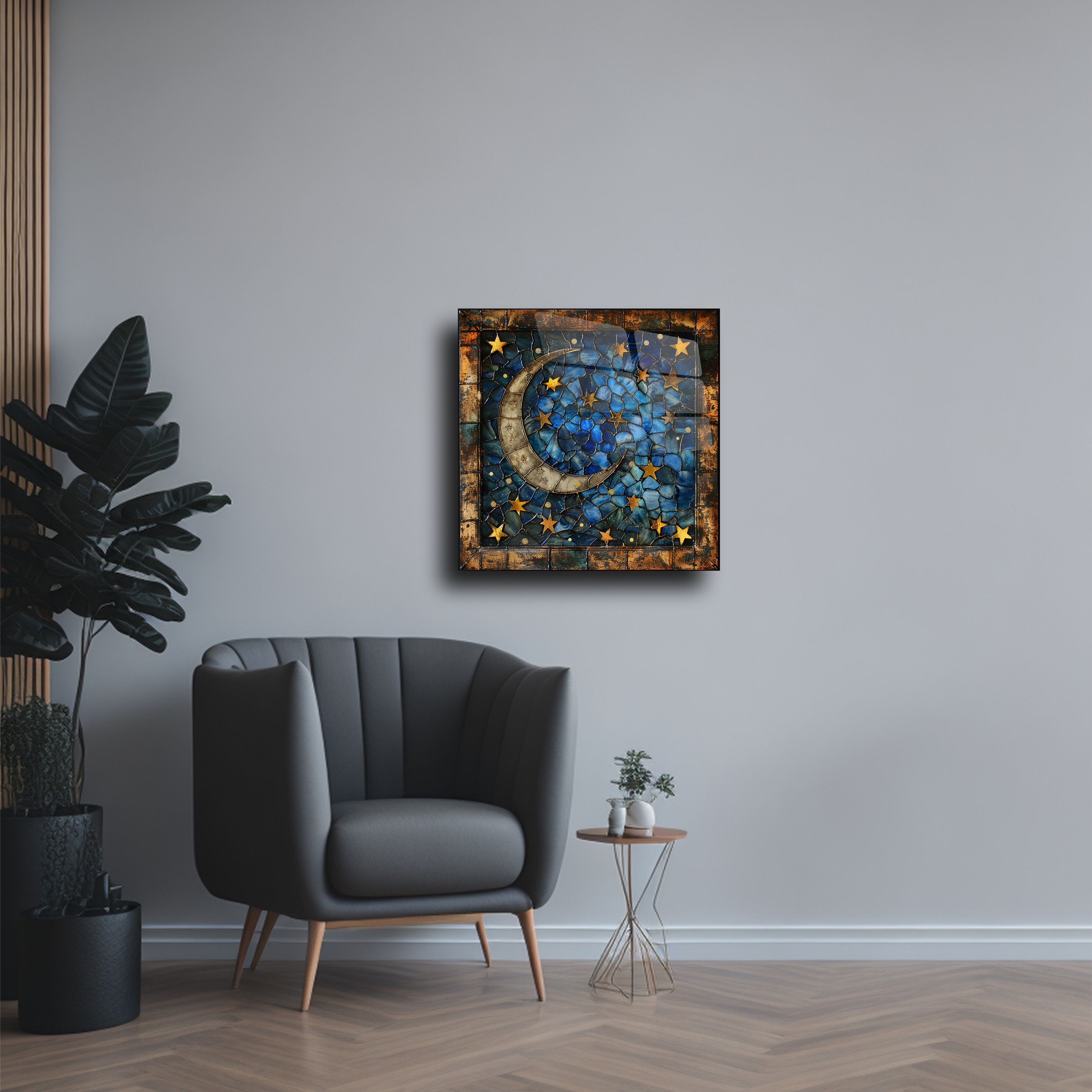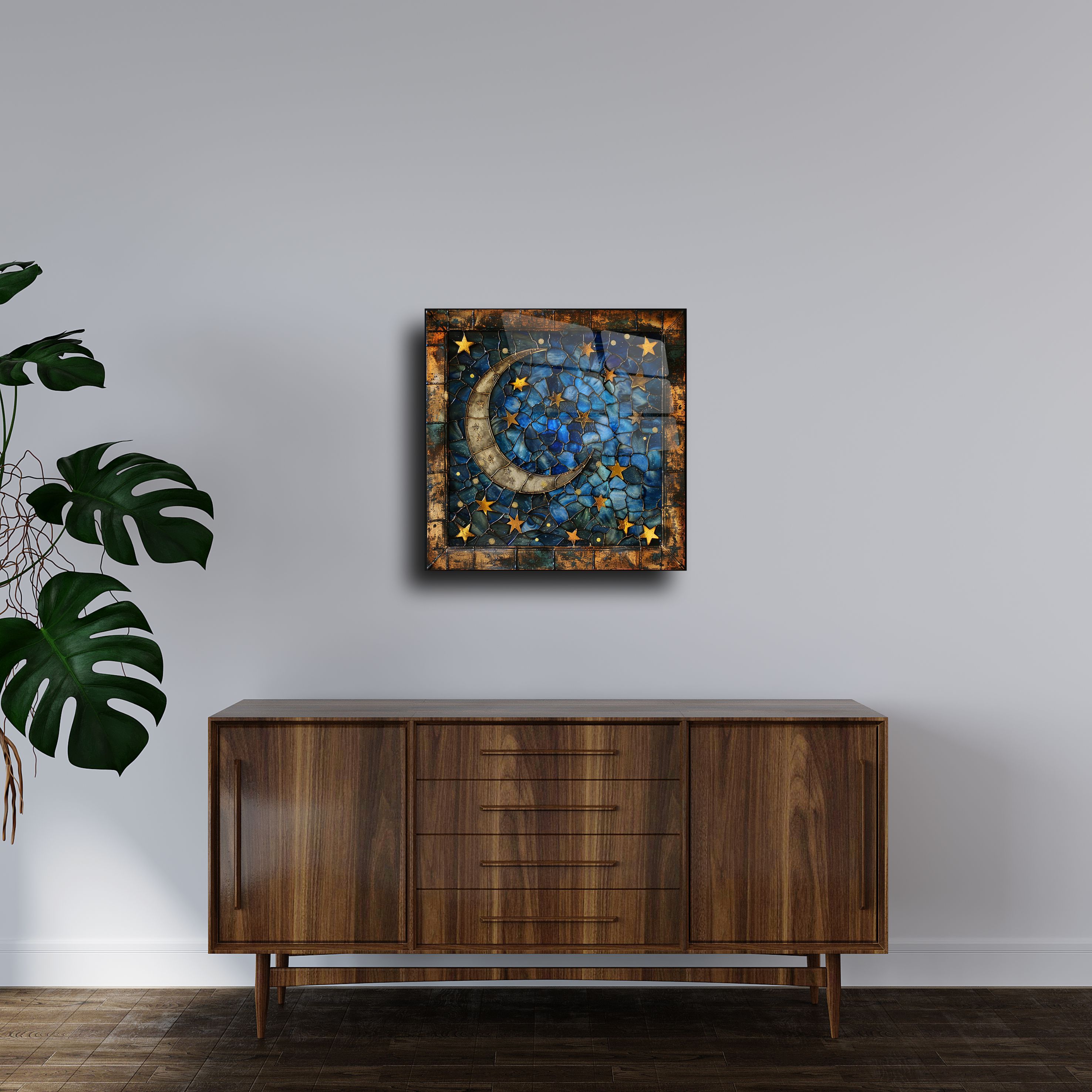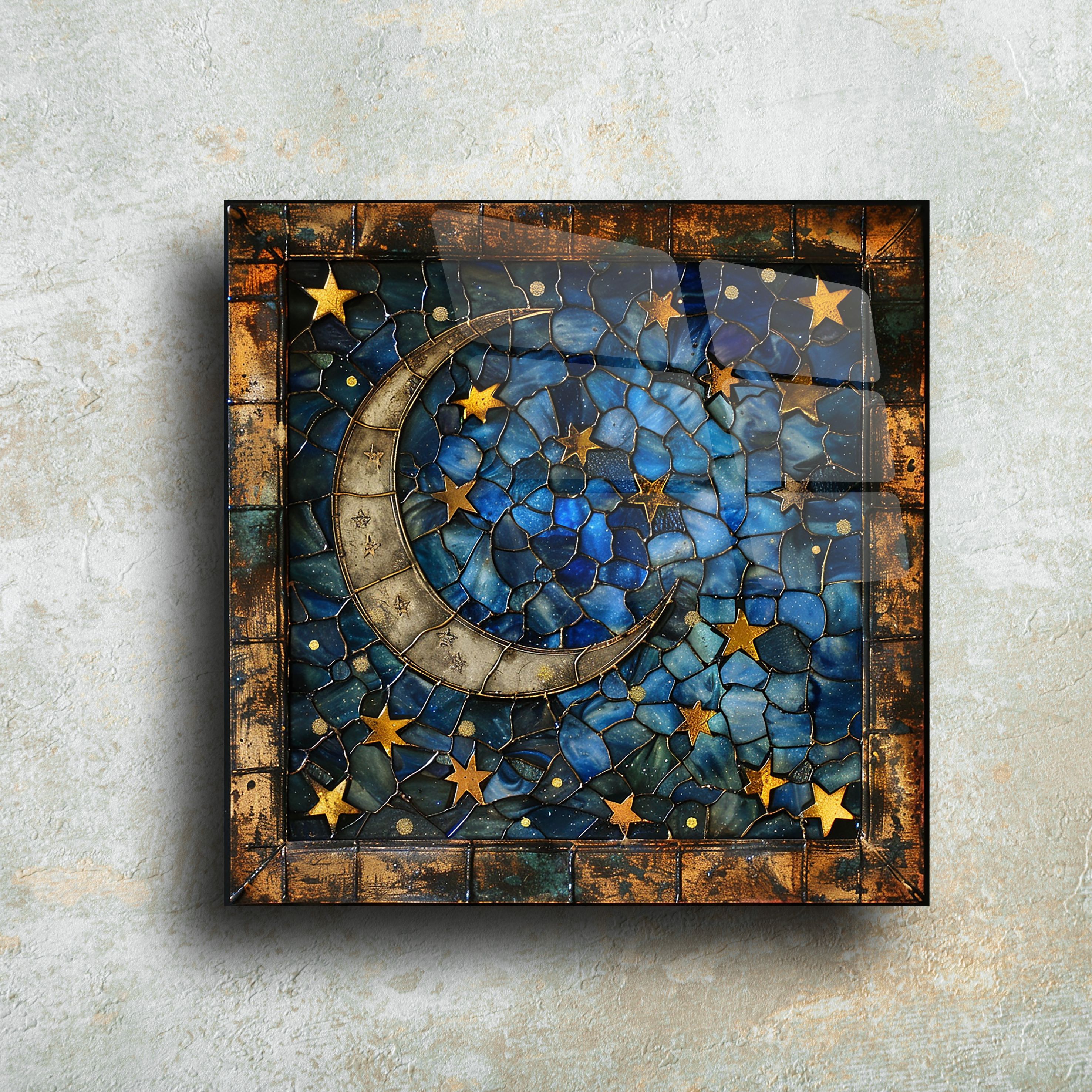 Evinizde yıldızlı bir gece havası yaratmaya ne dersiniz? El yapımı ay ve yıldız temalı bu cam tablo, zarif mozaik işçiliğiyle tasarlanmıştır ve estetik bir duruş sunar. Mavi ve altın tonlarının büyüleyici uyumu sayesinde hem modern hem de klasik mekanlarla kolayca uyum sağlar. Ürün, 4 mm dayanıklı temperli cam üzerine UV baskı tekniği ile üretilmiştir.