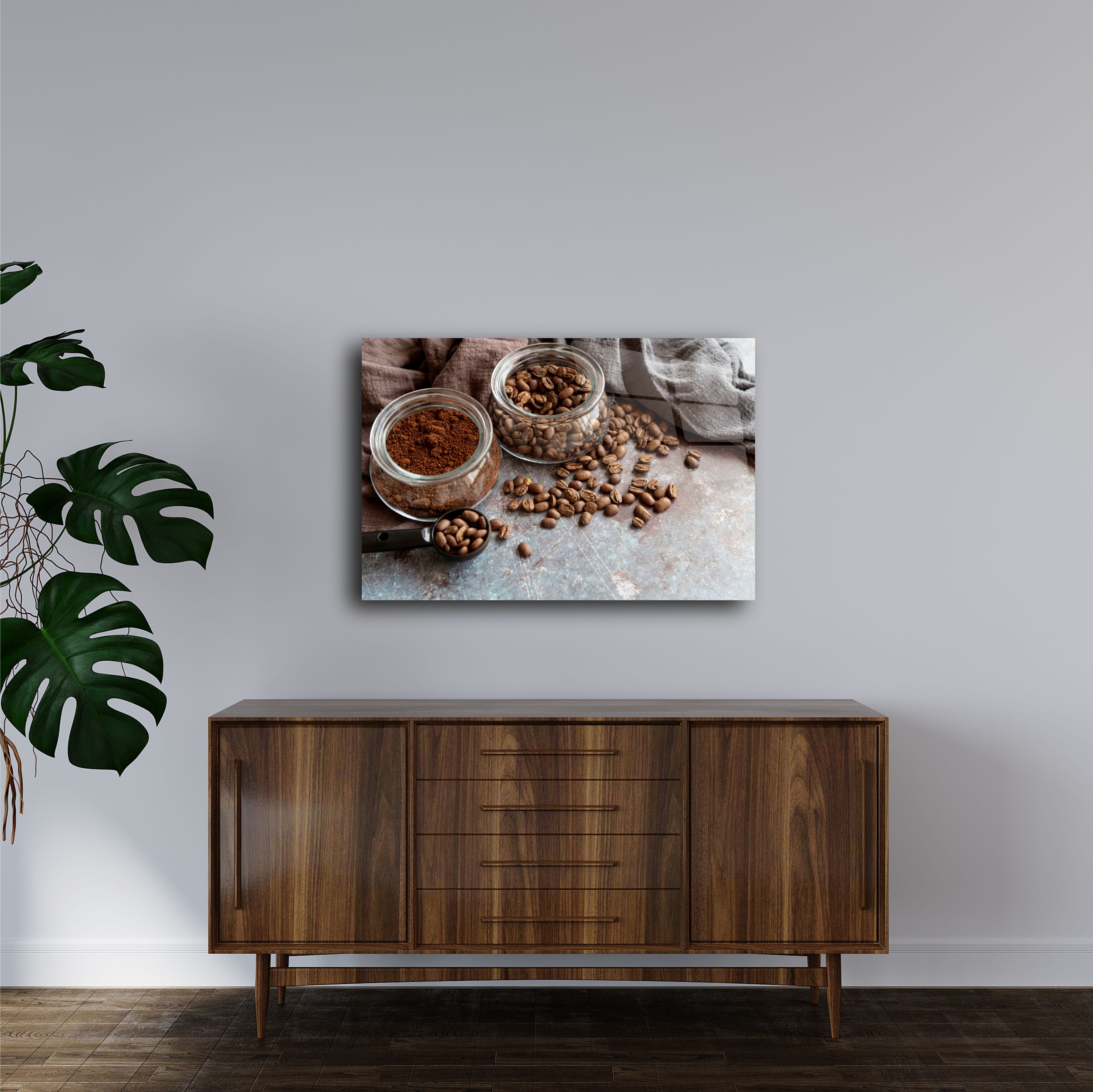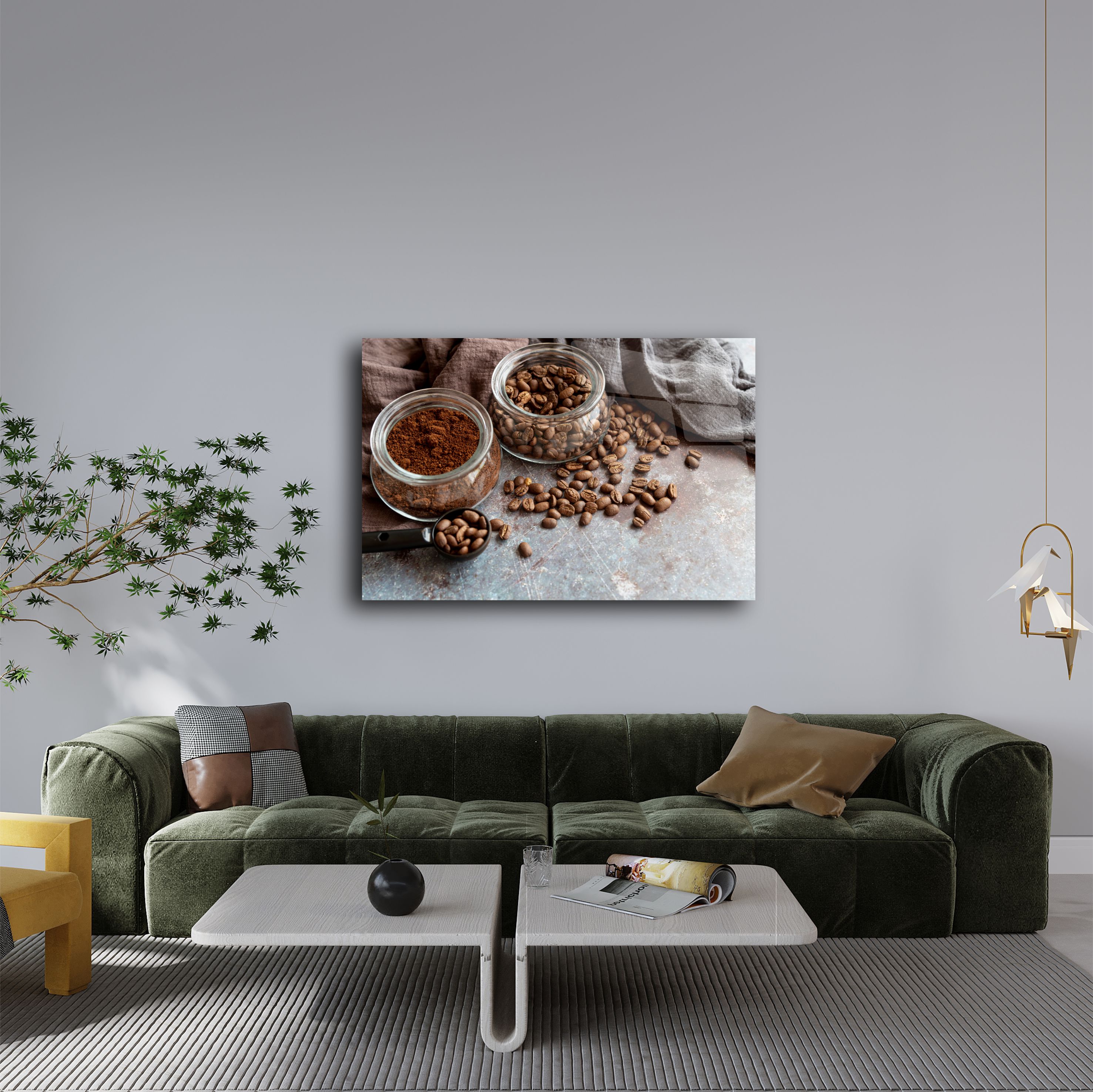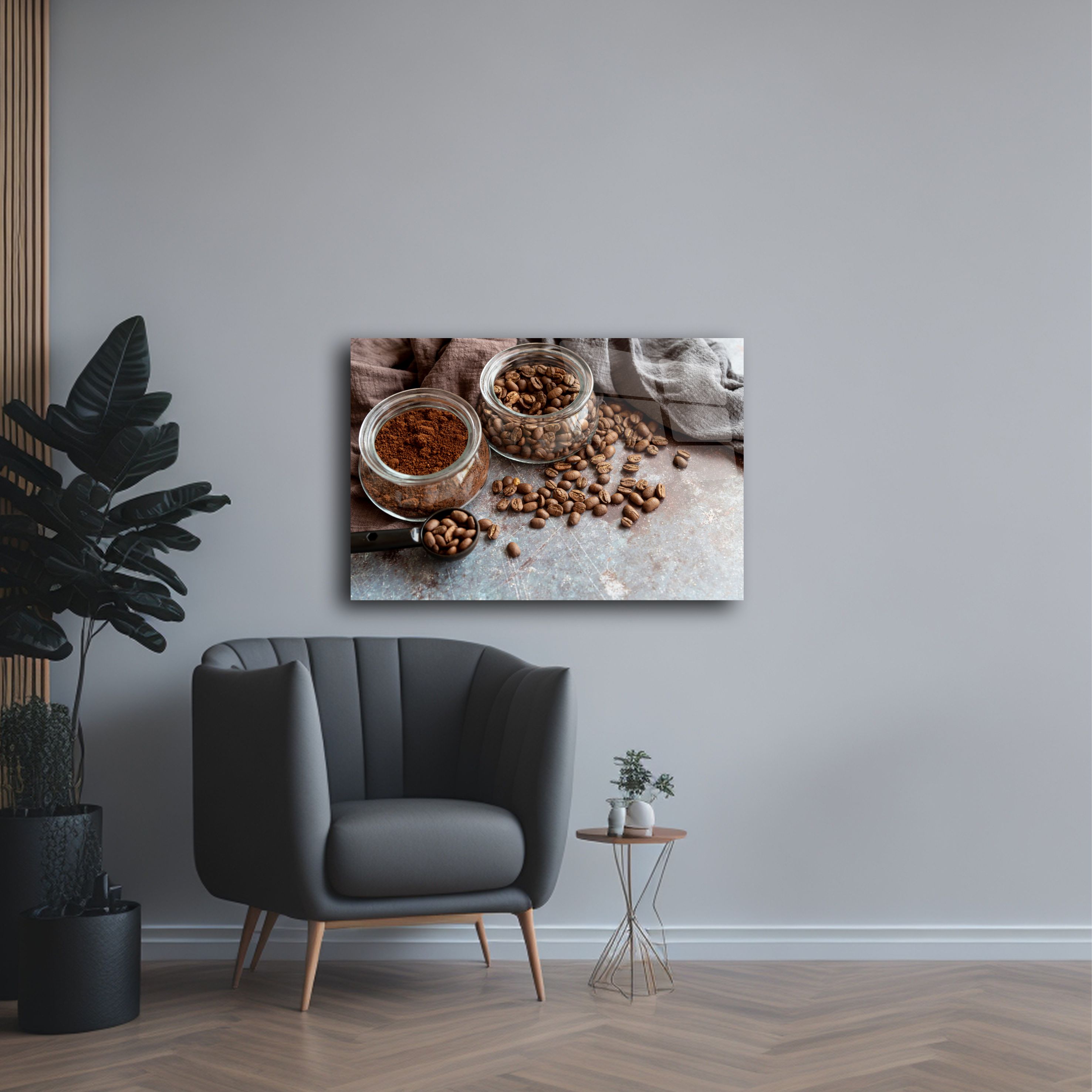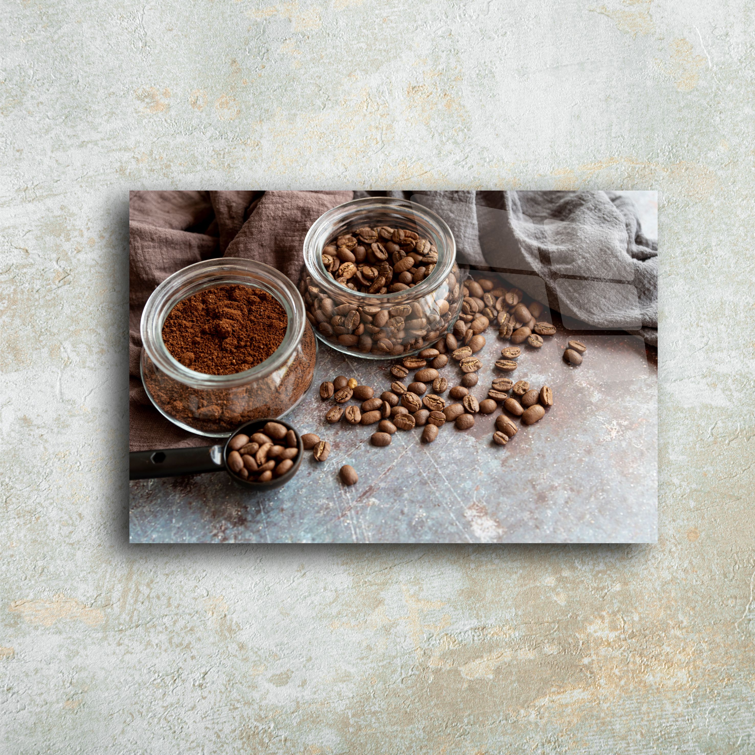 Kahve tutkunları için tasarlanmış bu cam tablo, doğal kahve çekirdekleri ve tozuyla hayatınıza şıklık katıyor. Sıcak ve doğal bir atmosfer yaratmak için idealdir.