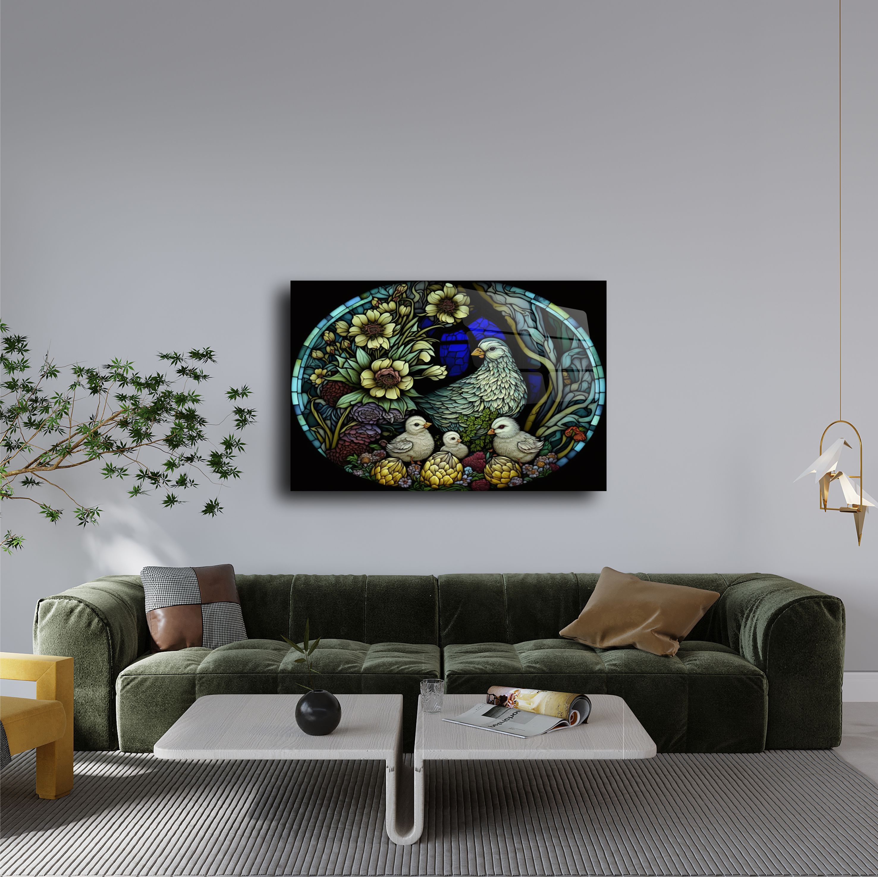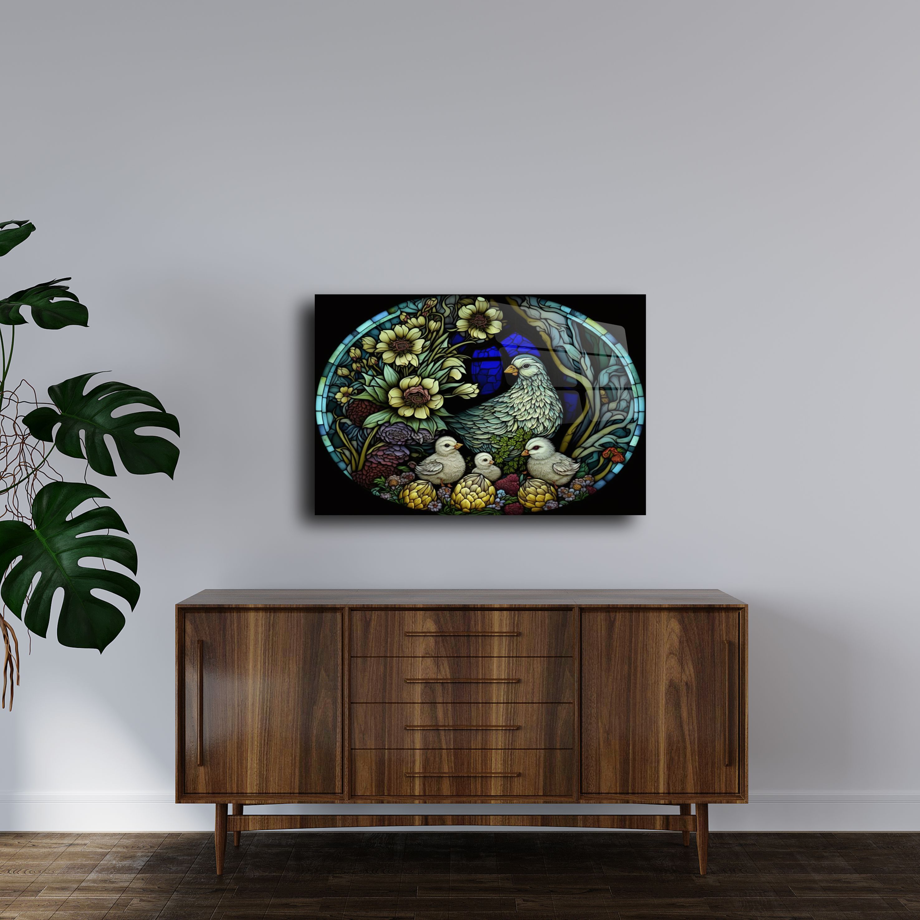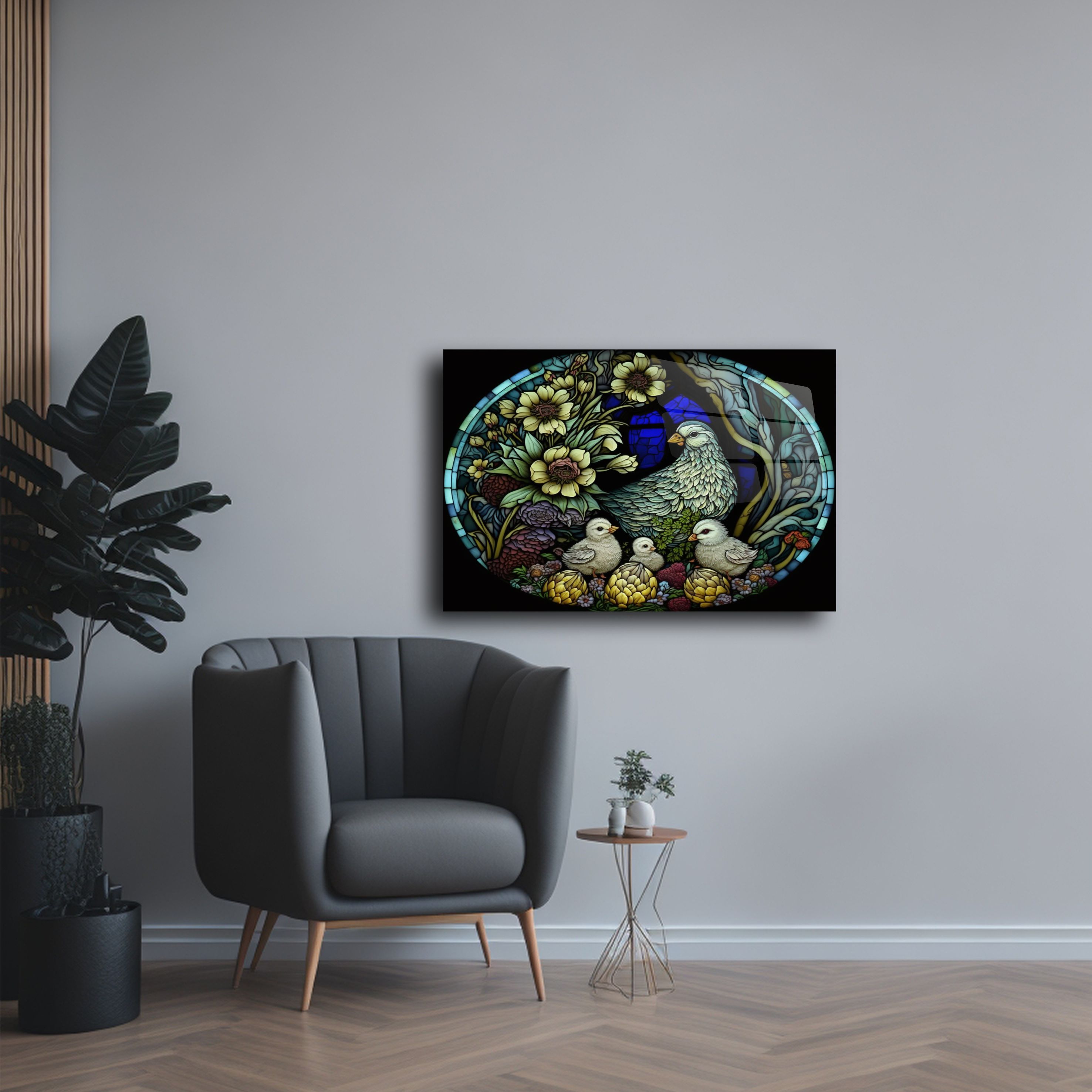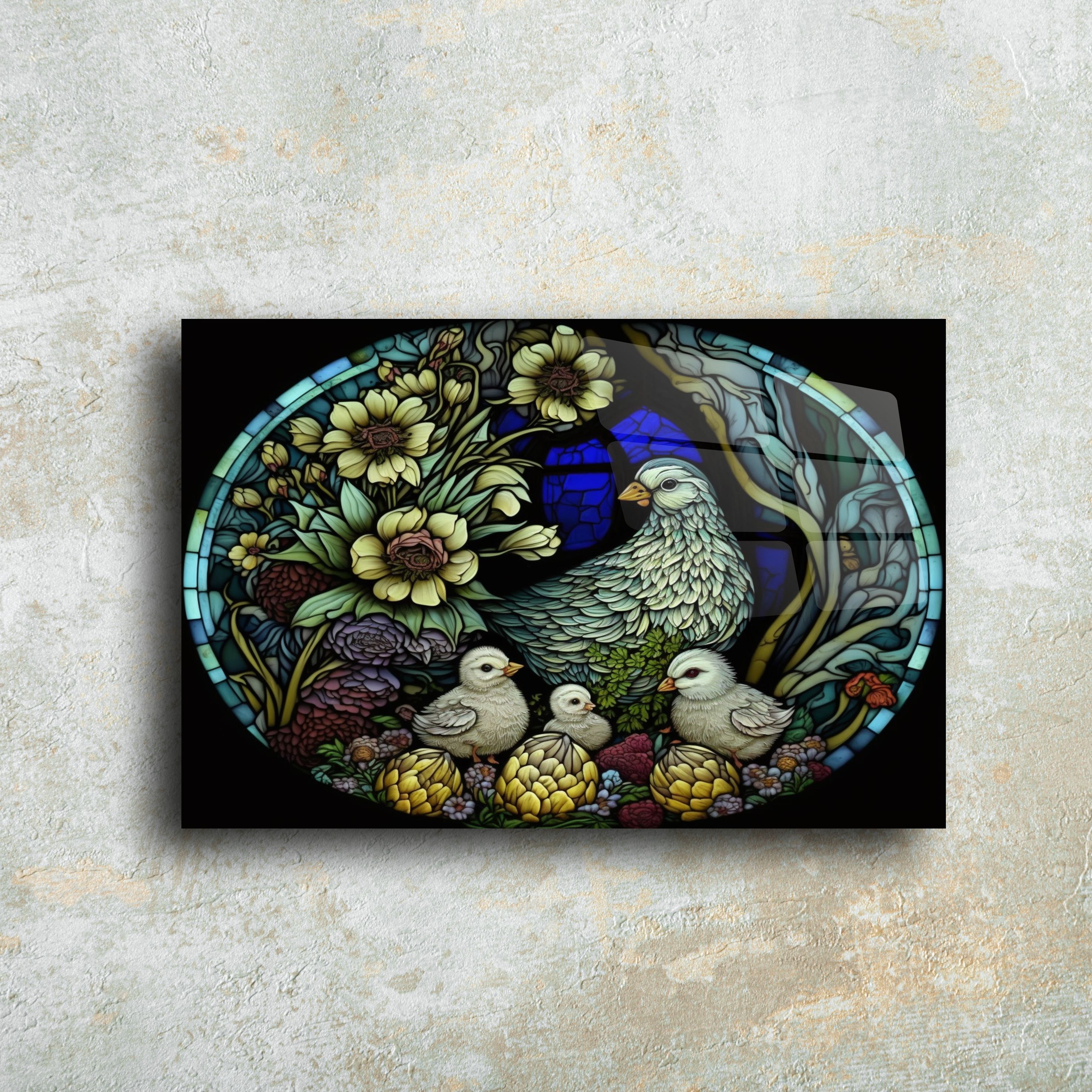 Evinizi bir sanat galerisine dönüştürmek ister misiniz? Vitray stili tavuk ve civciv desenli bu cam tablo, zamansız bir estetik anlayışı ile tasarlandı. 4 mm kalınlığında temperli cam üzerine UV baskı teknolojisi ile uygulanan bu tablo, netliği ve renk canlılığıyla dikkat çeker.