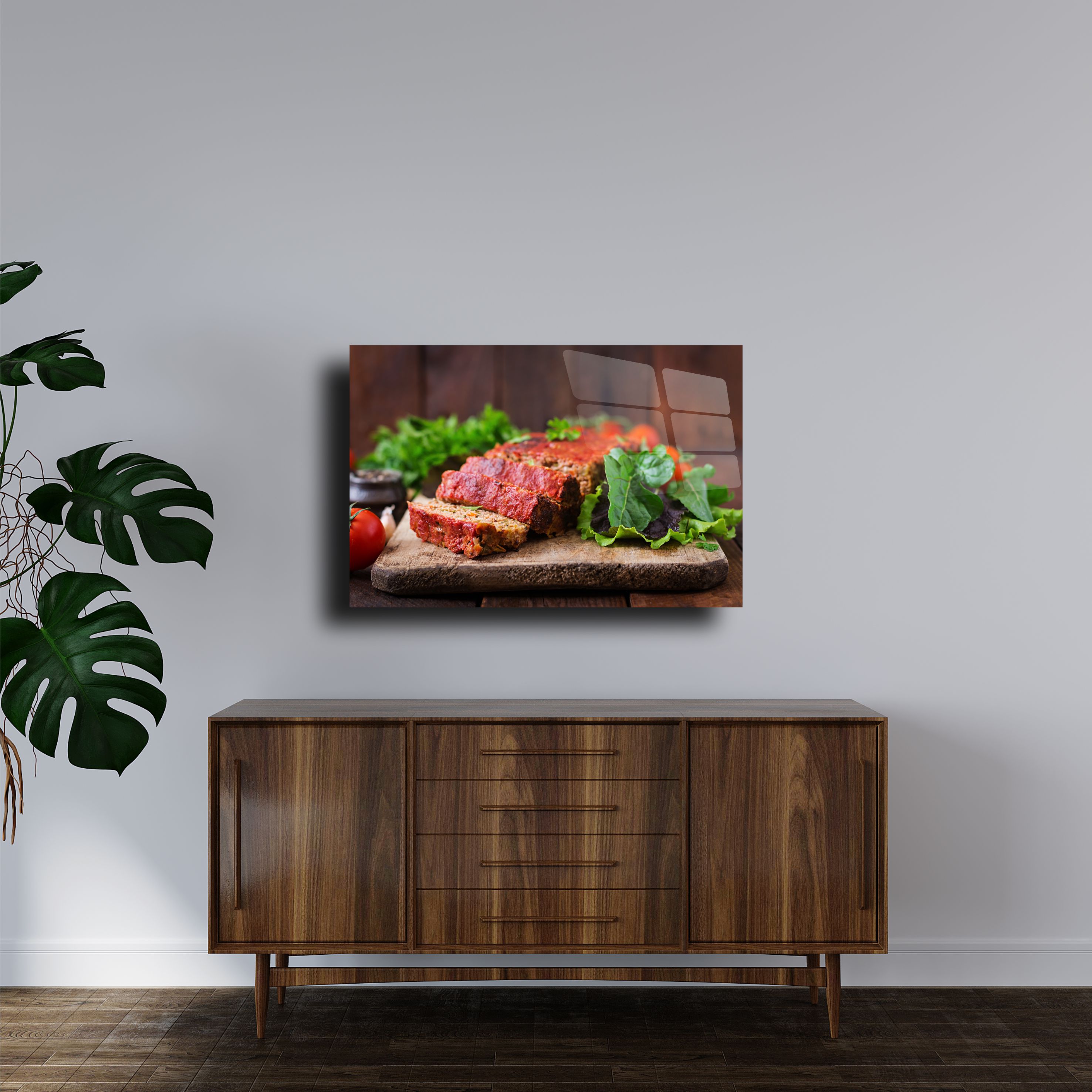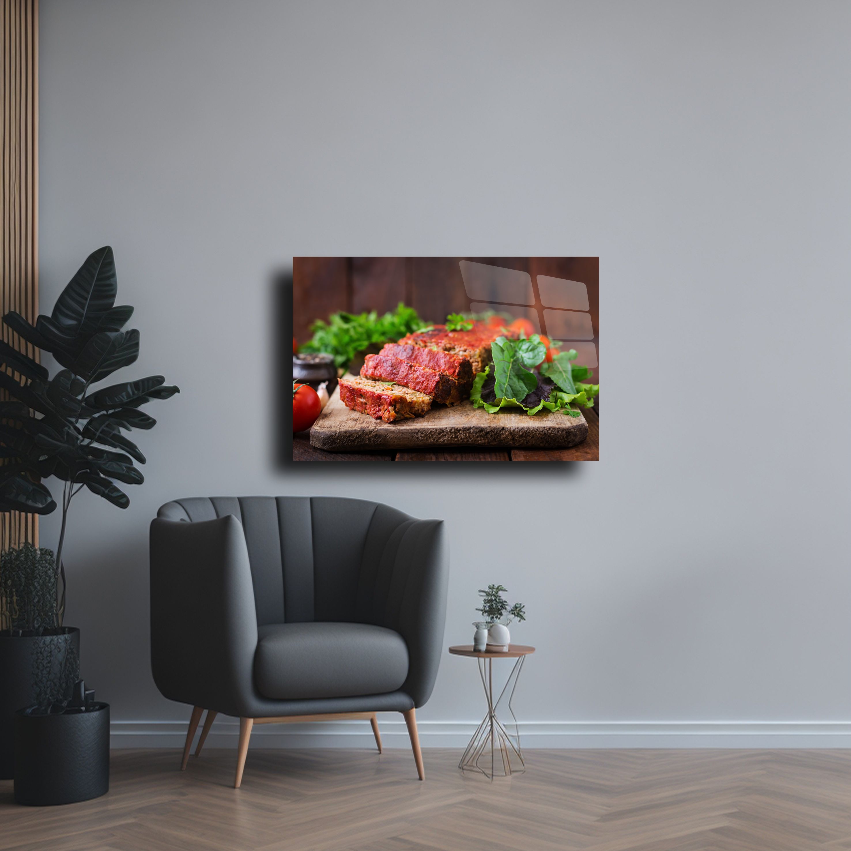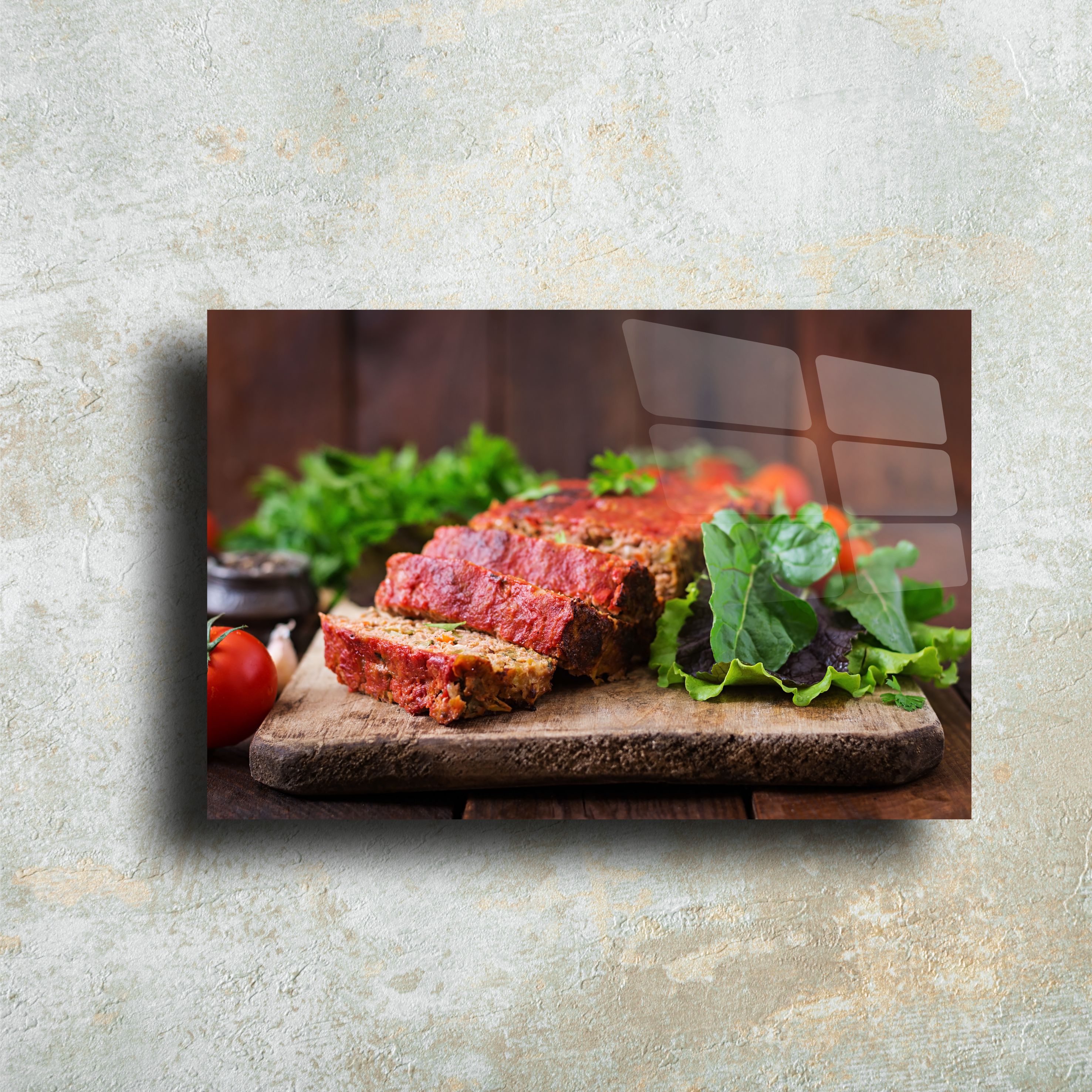 Evinizi veya ofisinizi bu modern cam tabloyla renklendirin! Yemek temalı bu zarif tasarım, lezzetli bir et yemeği görseliyle dikkat çeker ve özellikle mutfak ve yemek odası dekorasyonu için mükemmel bir seçenektir.