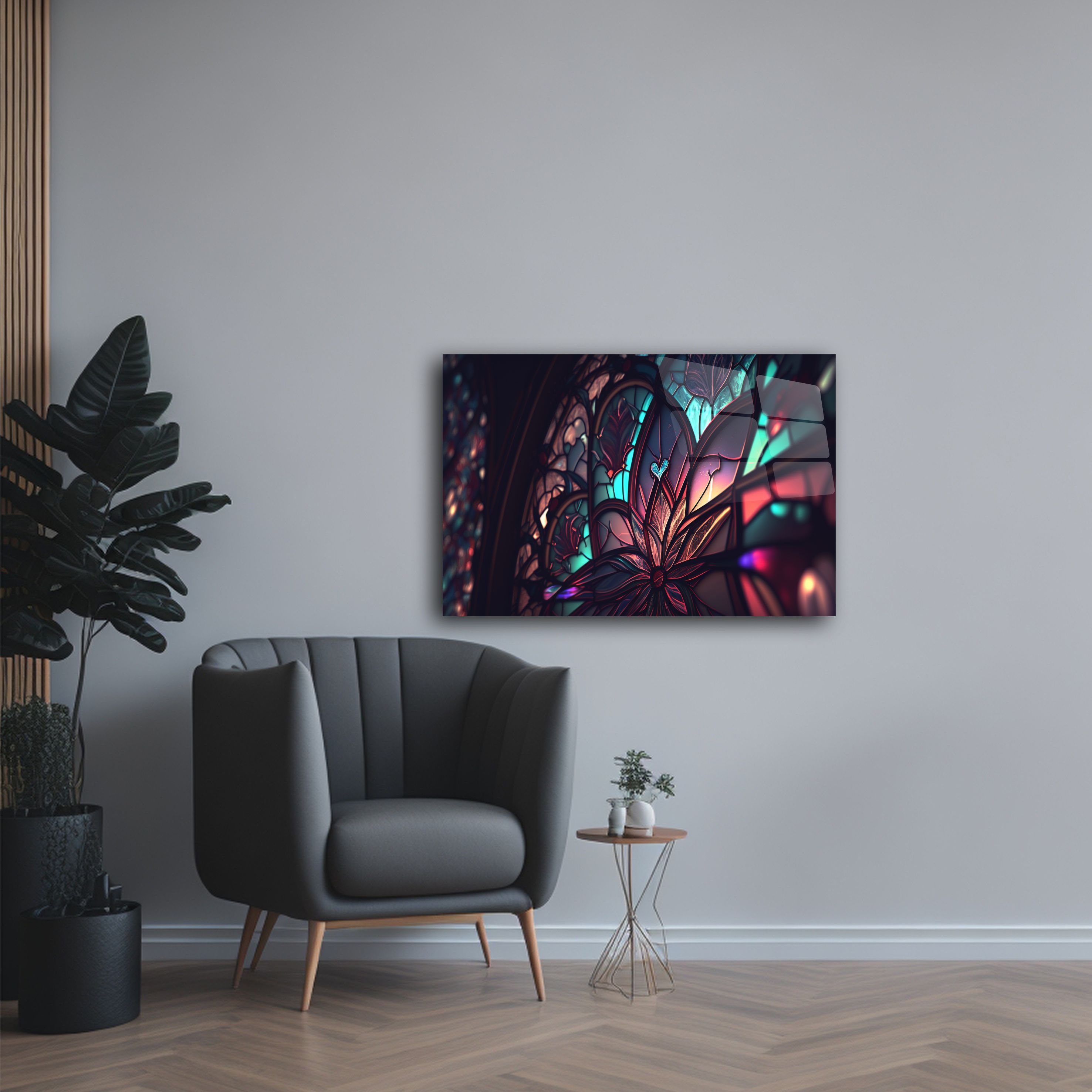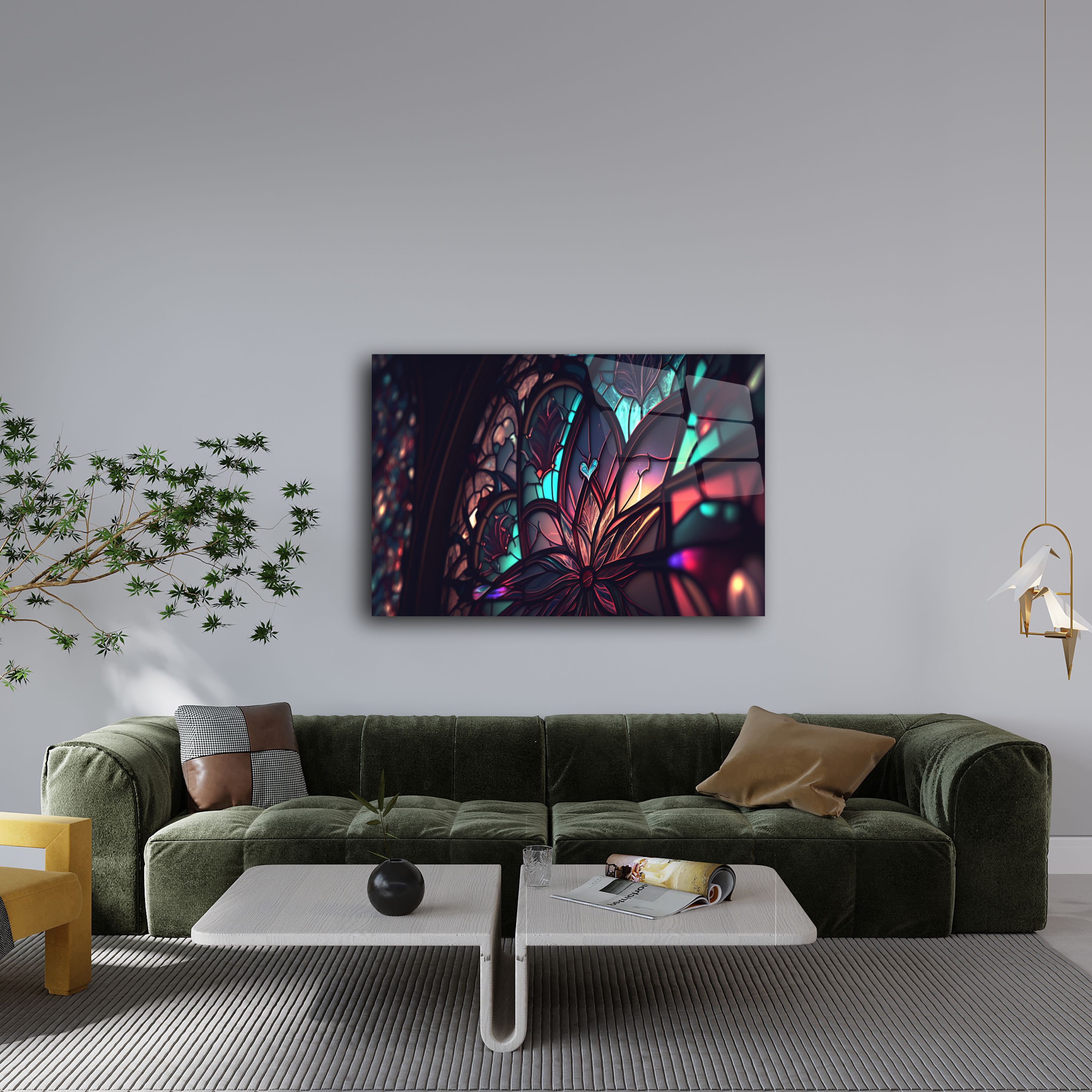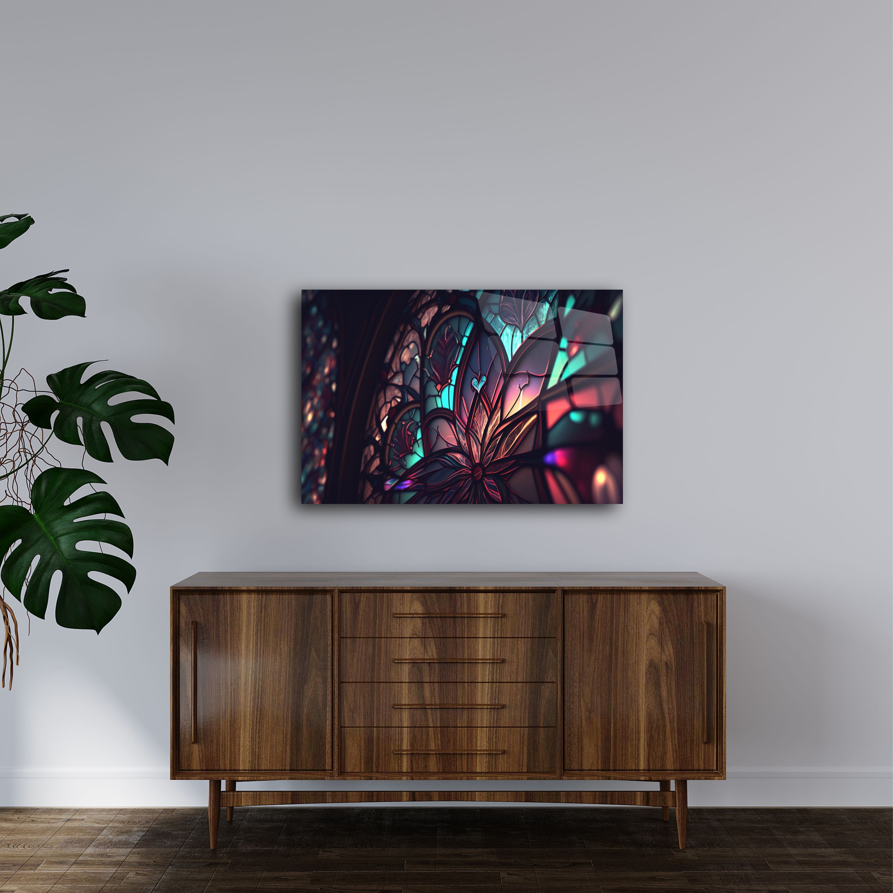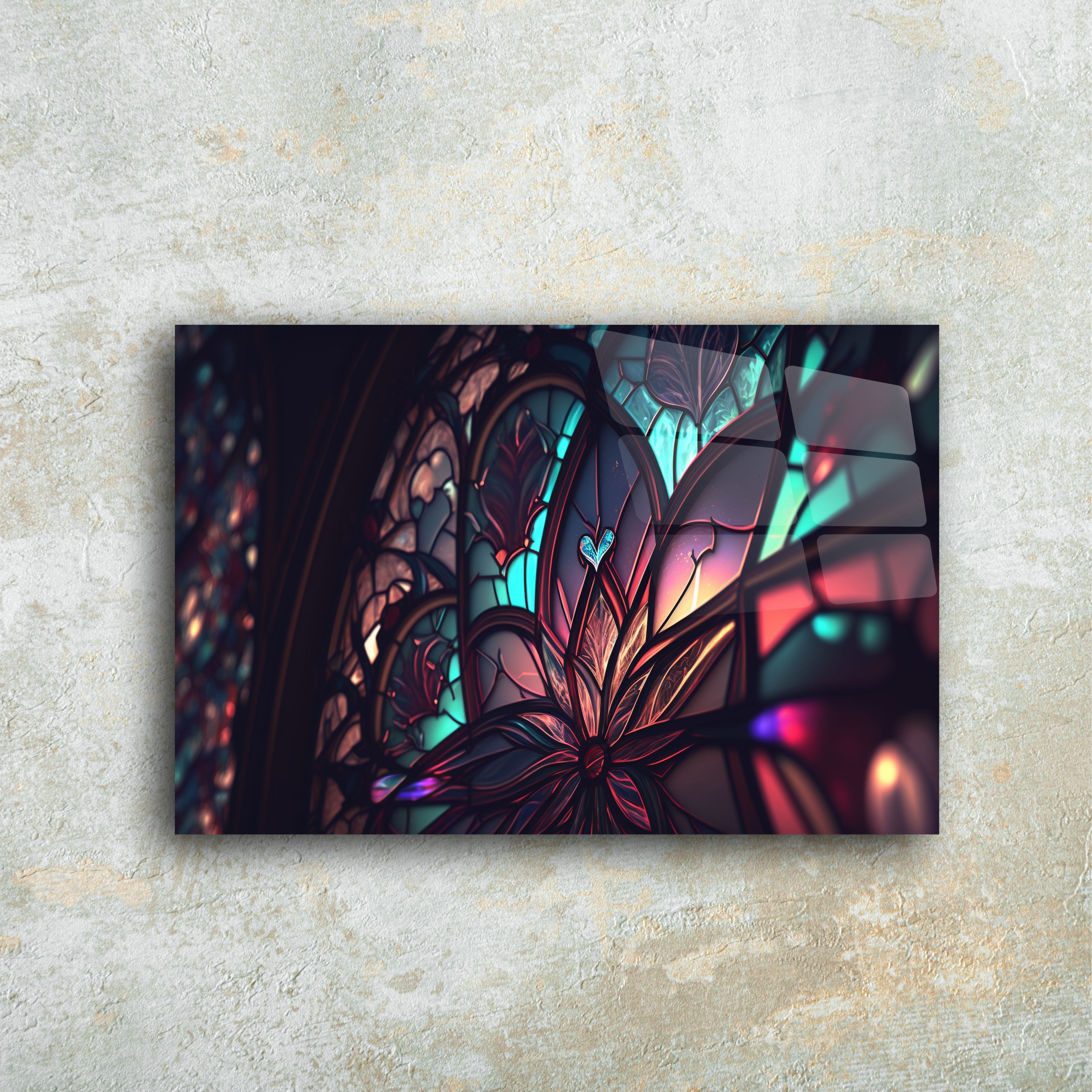 Evinizin dekorasyonunda fark yaratacak olan bu vitray desenli cam tablo, sanatın modern bir yansıması olarak karşınıza çıkıyor. Renklerin ve ışığın muhteşem uyumuyla tasarlanmış olan bu tablo, şıklığı ve zarafeti bir araya getiriyor.