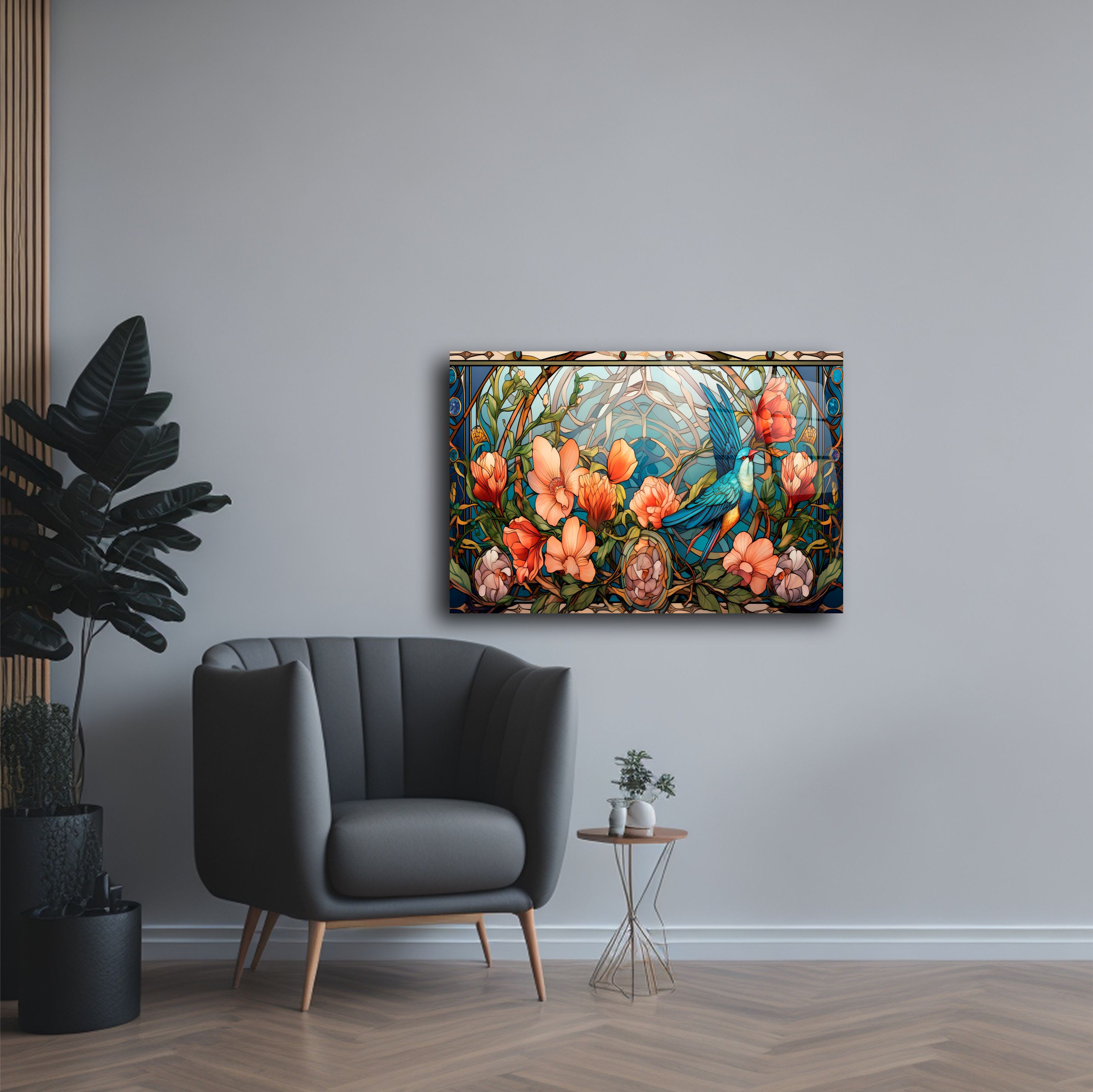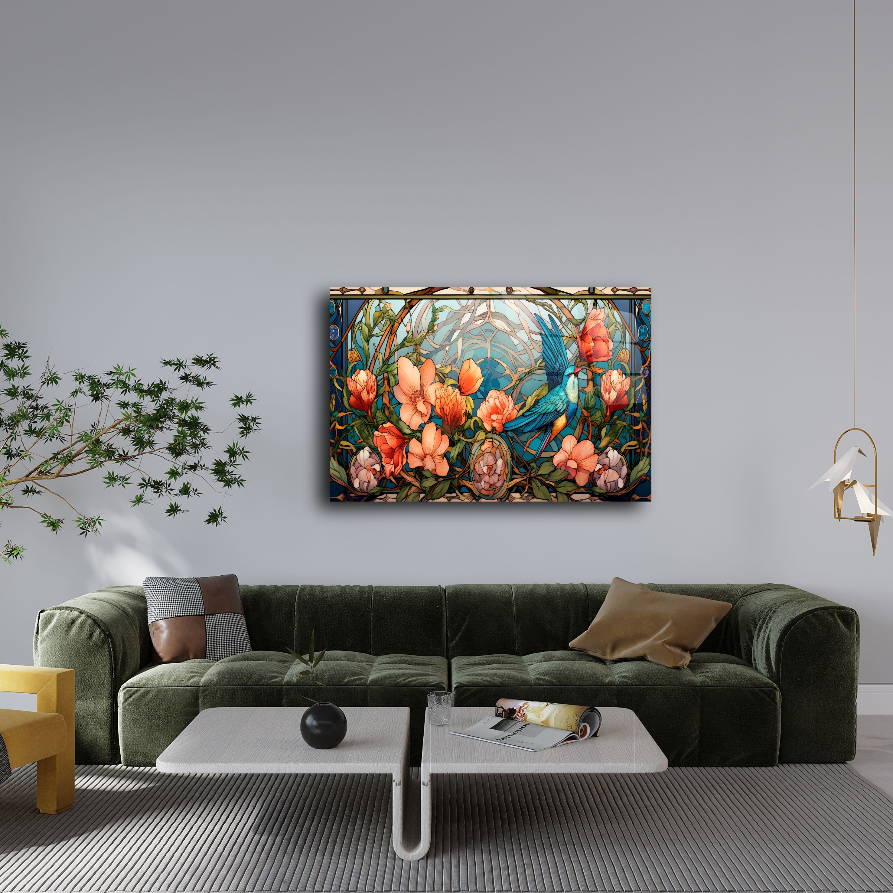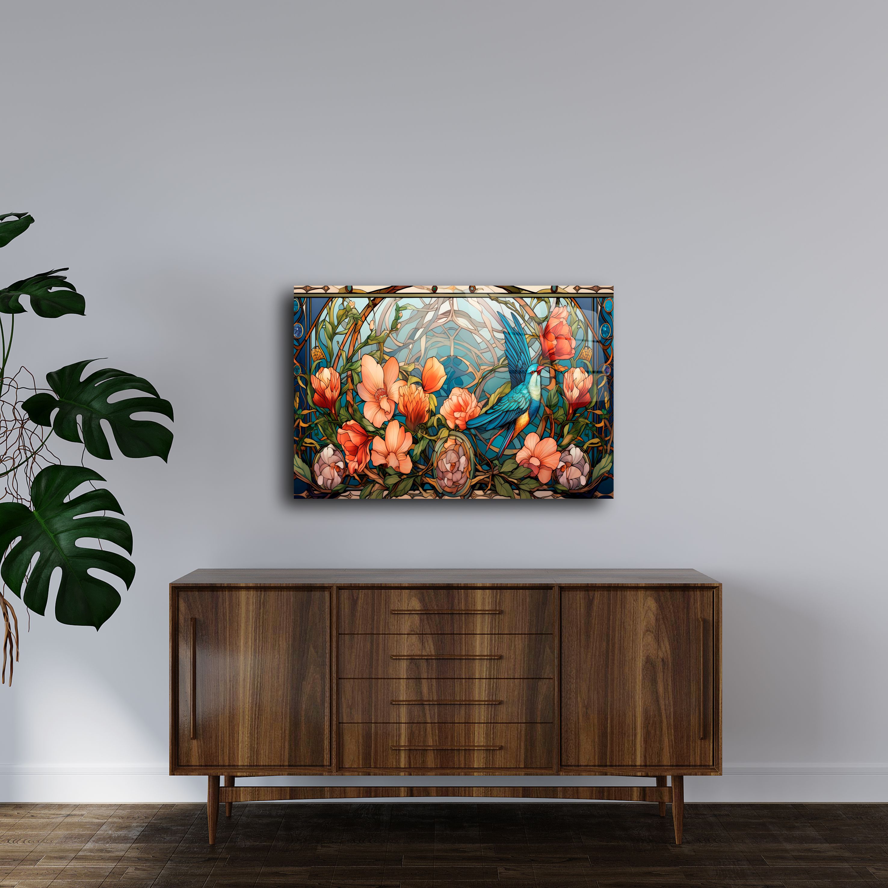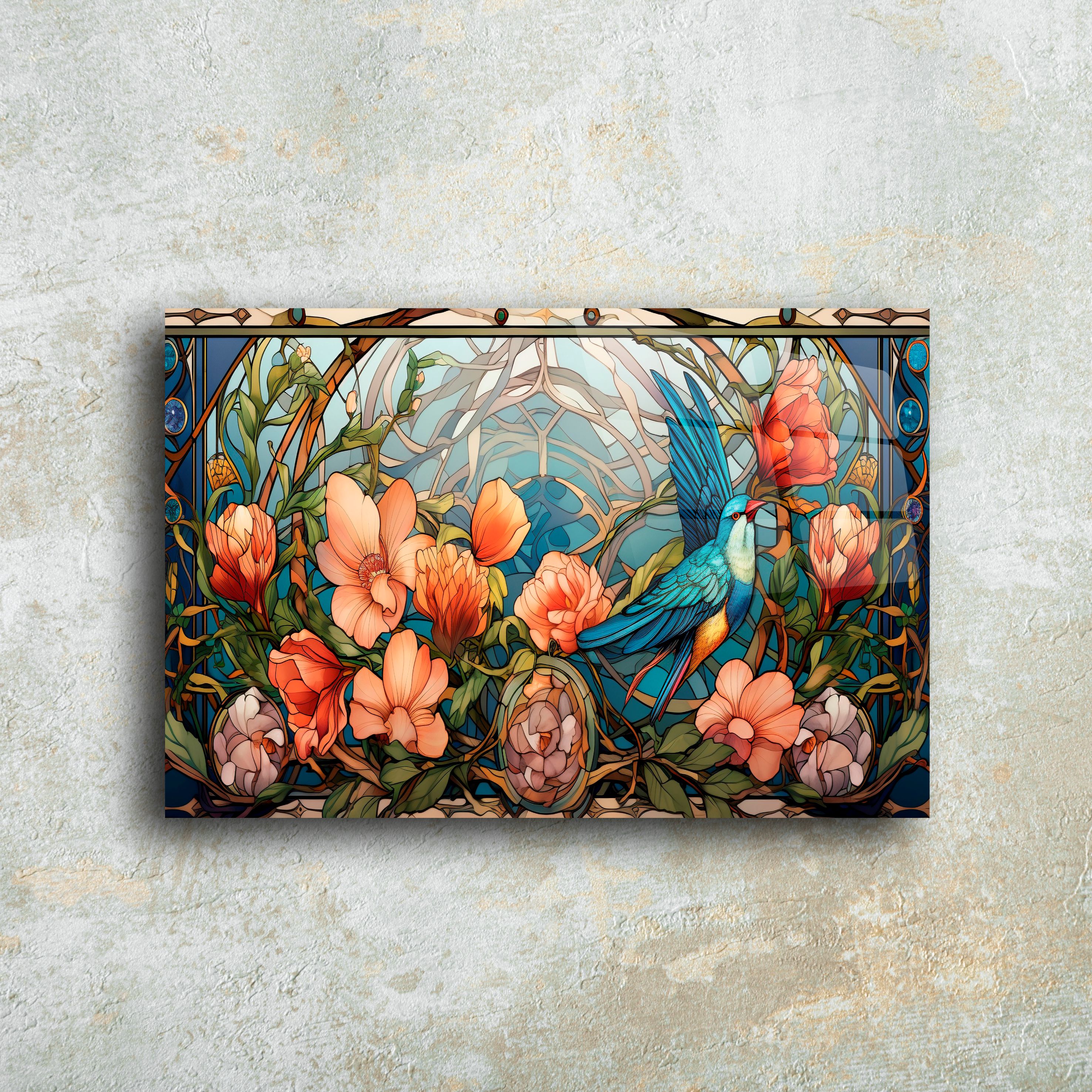 Evinizin dekorasyonunu benzersiz bir şekilde tamamlayacak bu kuş ve çiçek temalı cam tablo, zarif vitray detayları ve canlı renkleriyle göz kamaştırıyor. Modern ve estetik tasarımıyla hem klasik hem de çağdaş yaşam alanlarına mükemmel uyum sağlar.