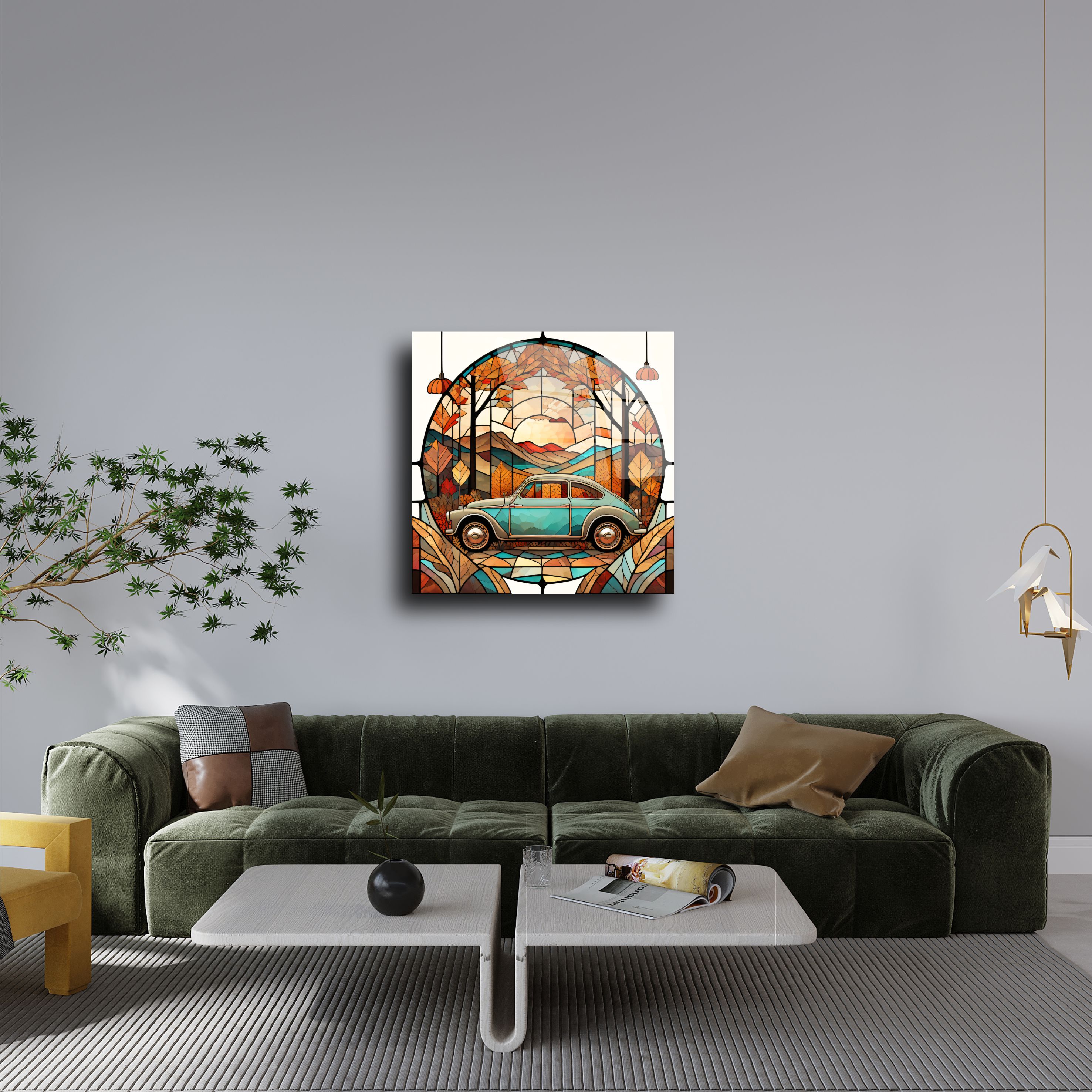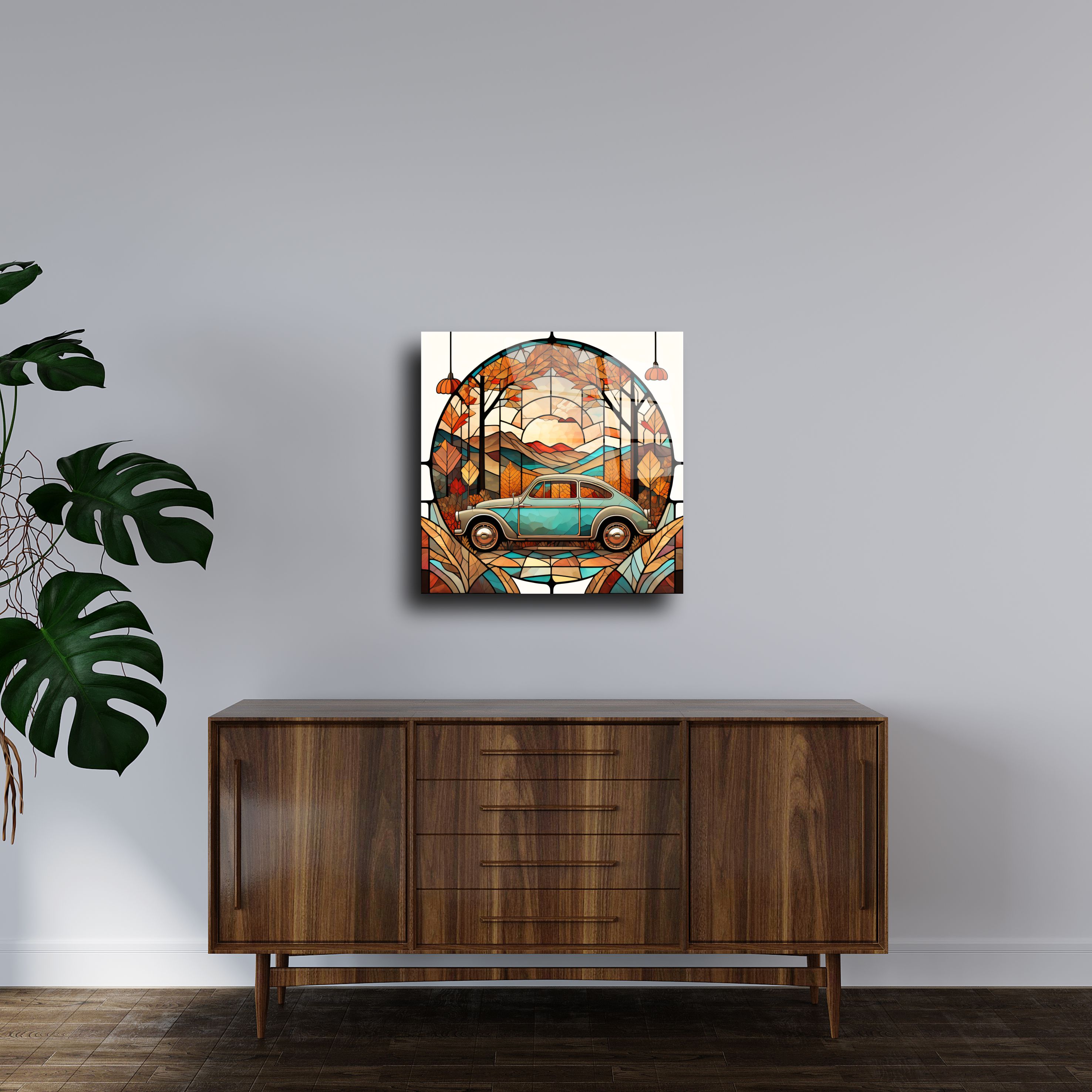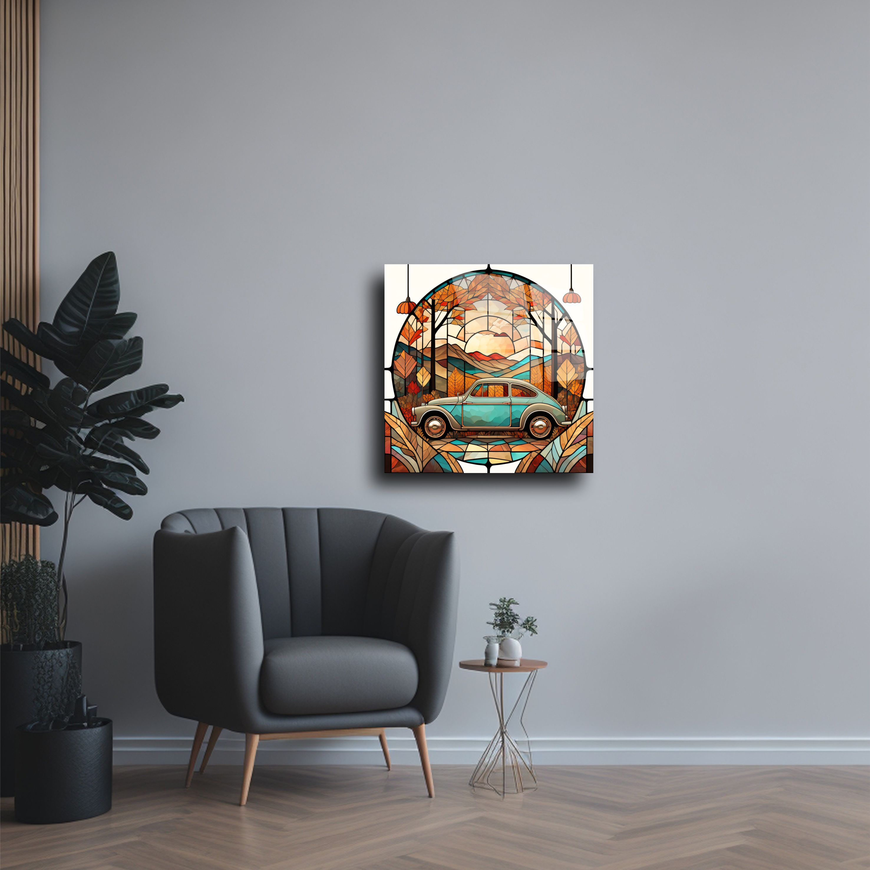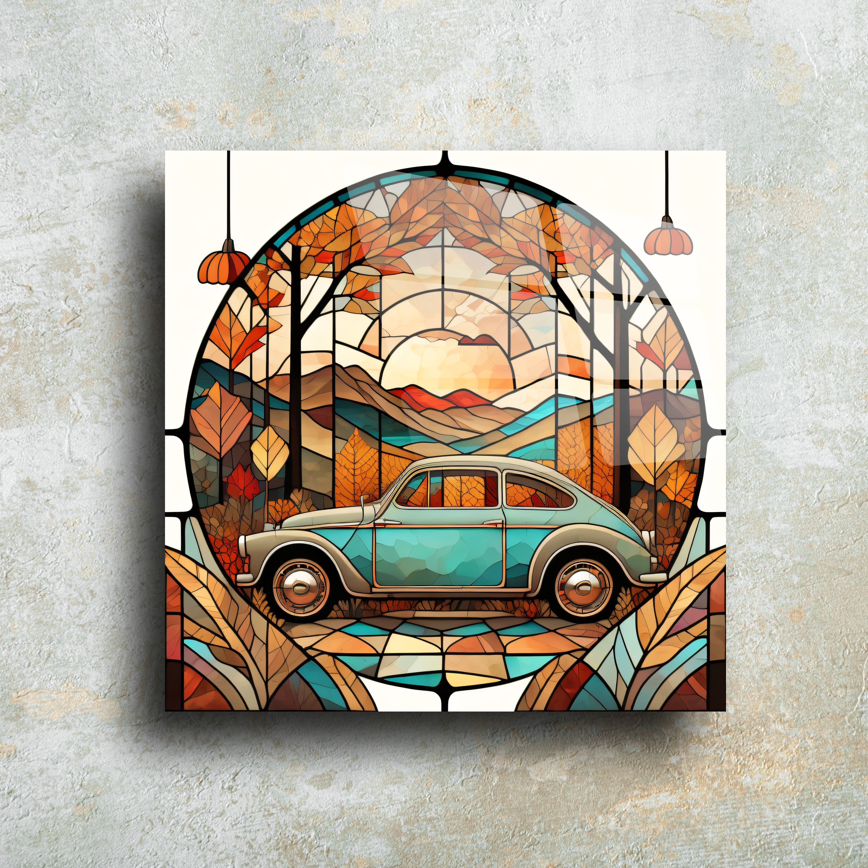 Bu özel tasarım cam tablo, vintage araba ve doğal manzara temasıyla ev dekorasyonunuza eşsiz bir şıklık kazandırır. El yapımı olarak üretilmiş bu cam panel, stained glass (vitray) sanatıyla modern tekniklerin buluştuğu zarif bir dekoratif üründür.